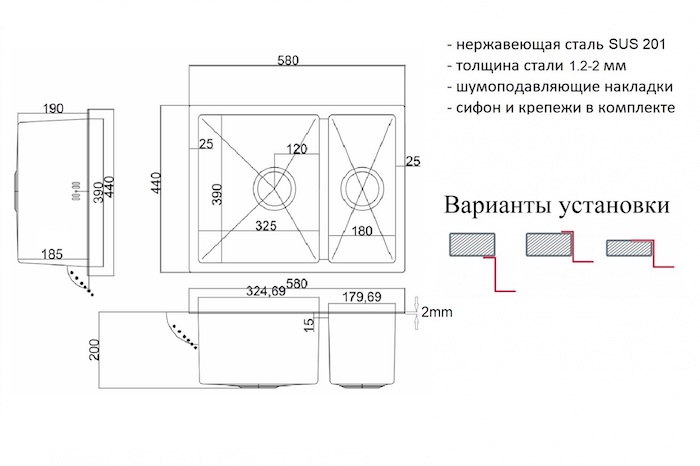 | Комплектация | Мойка, сливная арматура с корзинчатым вентилем 3 1/2, сифон с отводом, комплект креплений, шаблон |
