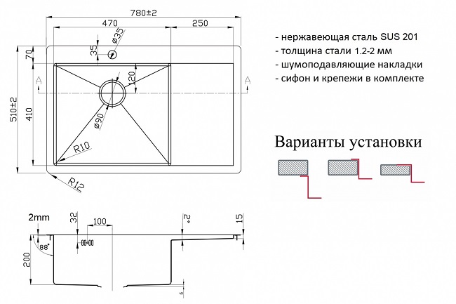 | Комплектация | Мойка, сливная арматура с корзинчатым вентилем 3 1/2, сифон с отводом, комплект креплений, шаблон. |