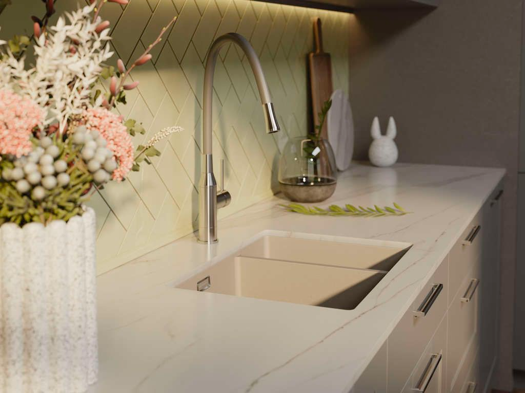 • Помимо гранита, в состав материала входит молотый кварц мельчайших размеров, которому характерны непревзойденная прочность и устойчивость к природным и химическим воздействиям. Свойства данного компонента вместе с долговечностью гранита обеспечивают мойке прочность и делают её устойчивой к любым механическим повреждениям: деформациям, сколам;