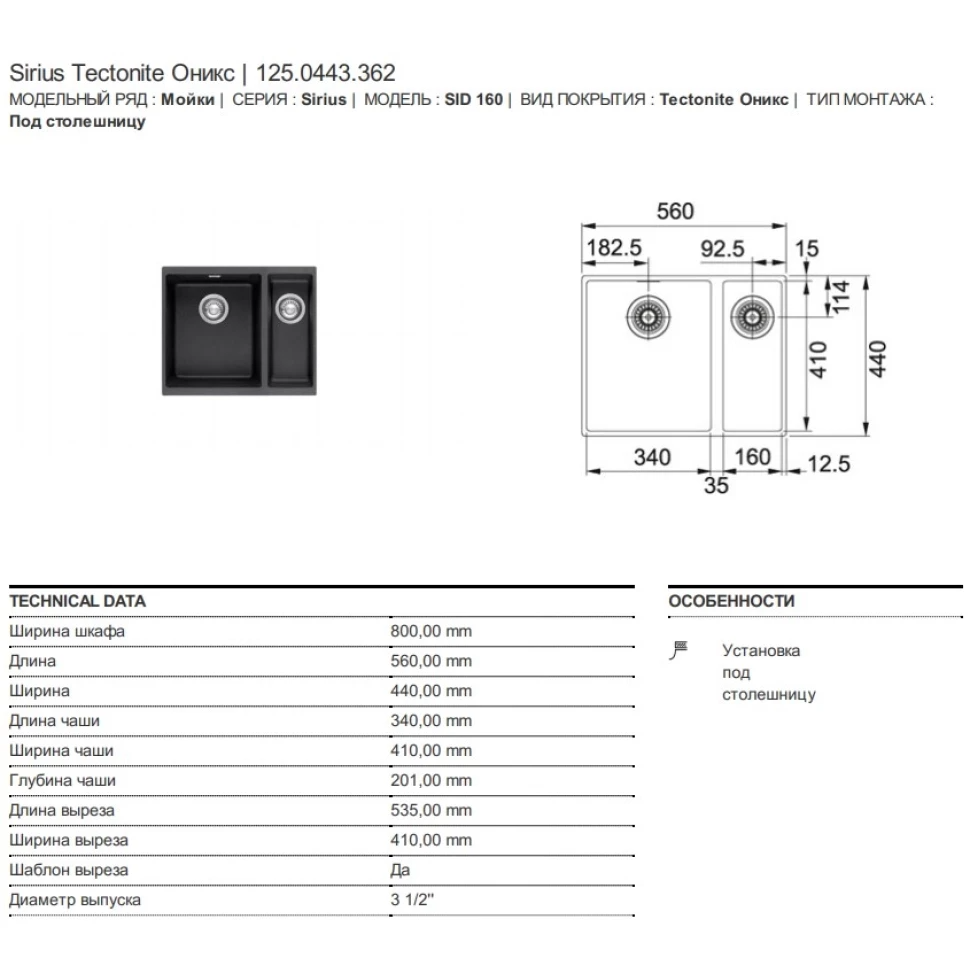 Мойка из тектонайта Franke Sirius SID 160 56х44 см оникс 125.0443.362