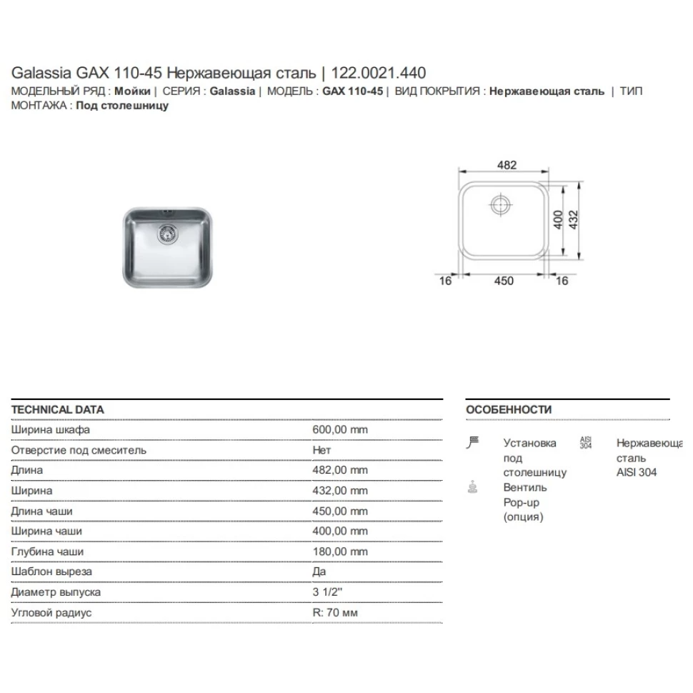 Стальная мойка Franke Galassia GAX 110-45 48,2х43,2 см полированная 122.0021.440