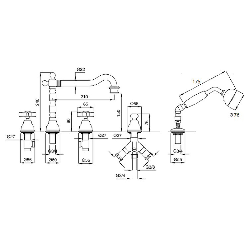 Смеситель для ванны на 5 отв. Migliore Princeton 19385 медь