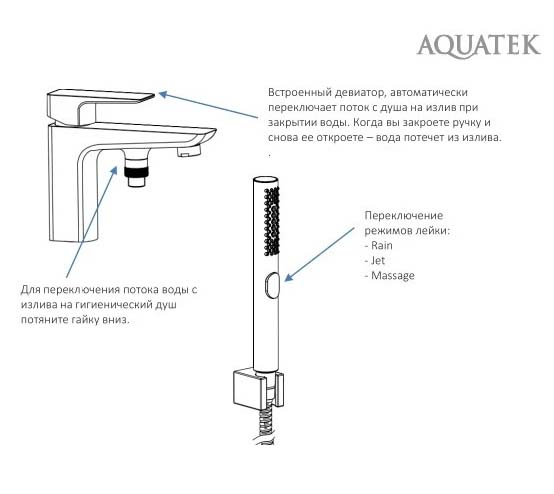 • встроенный девиатор, автоматически переключает поток с душа на излив при закрытии воды