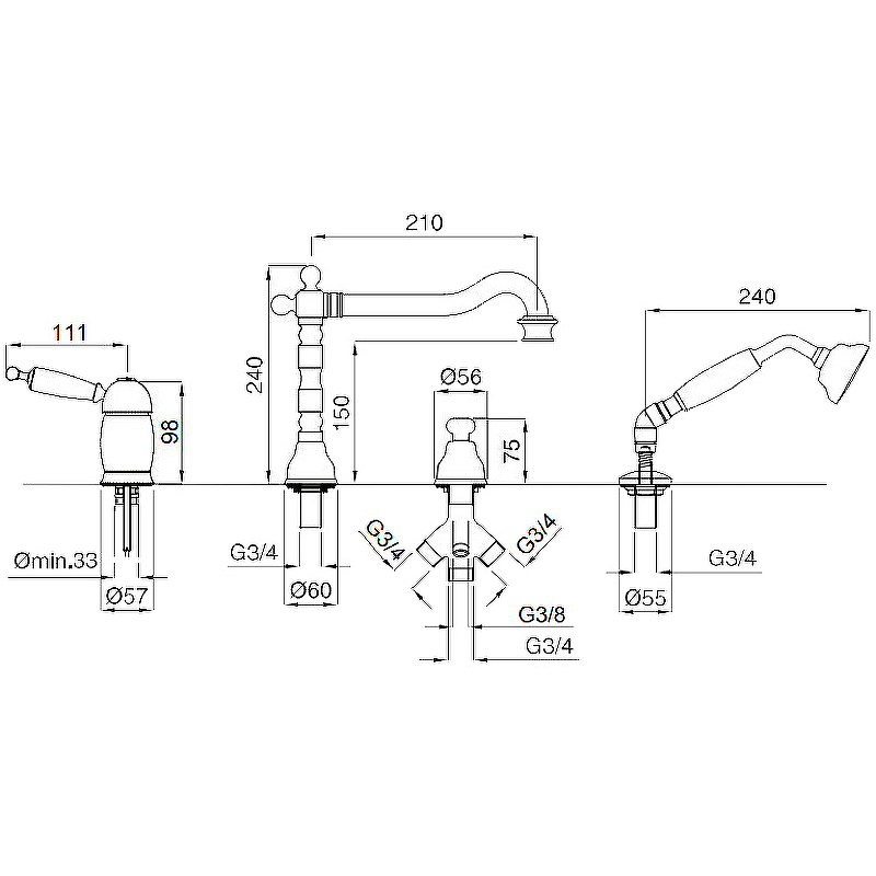 Смеситель на борт ванны на 4 отв.Migliore Oxford 19154 хром/золото
