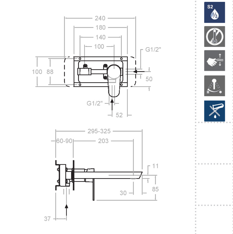 * Водосберегающая система S2 путем раскрытия ручки смесителя в два этапа.