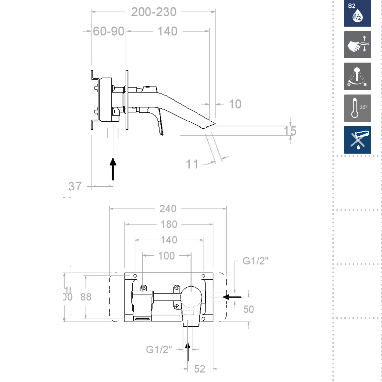 * Термостатический картридж с системой горячего блока для защиты от ожогов и системой термостата для блокировки температуры при 38°.