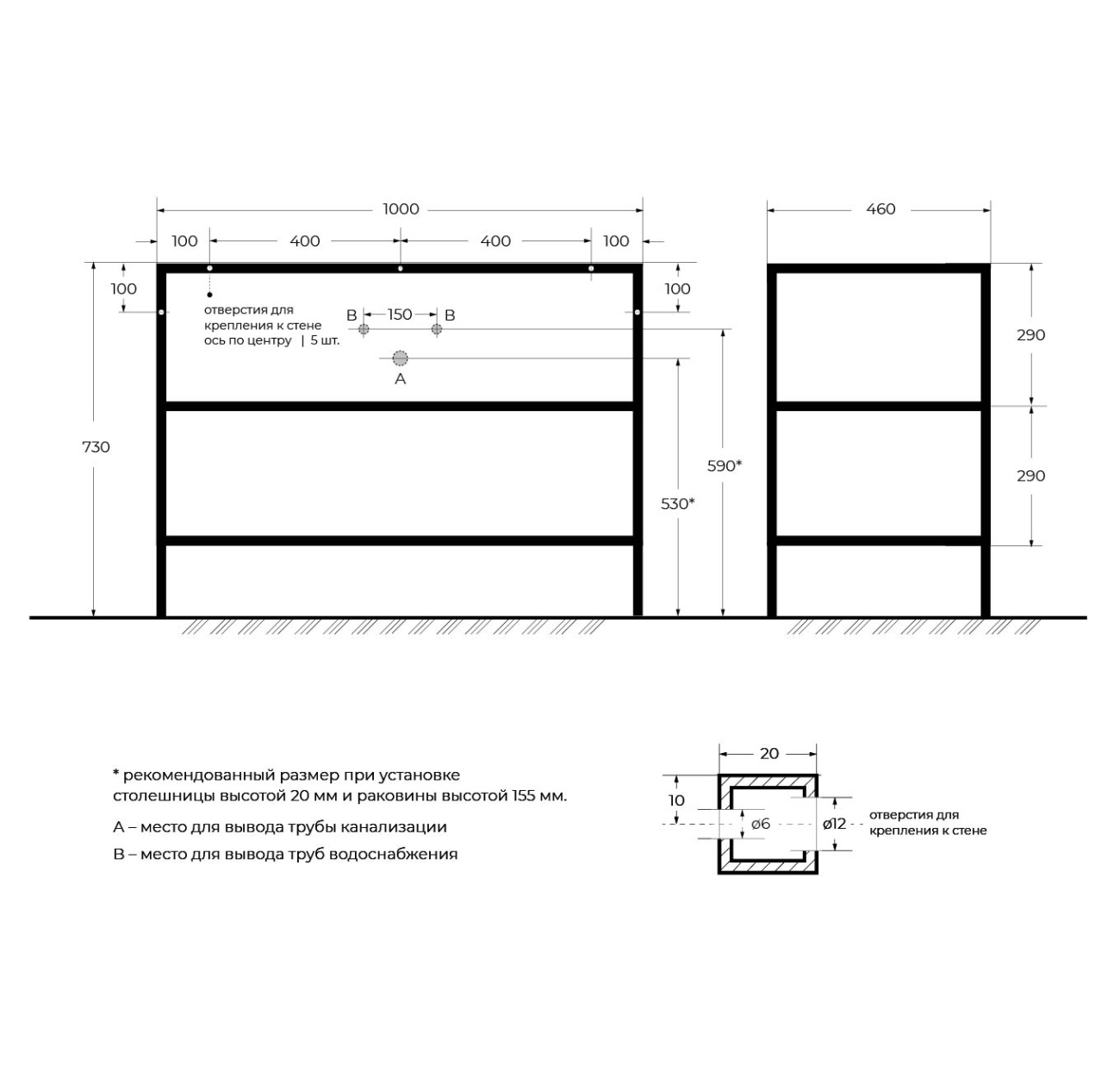 Вставка в дно сварного металлического каркаса под раковину, 116х42х1,6 см
