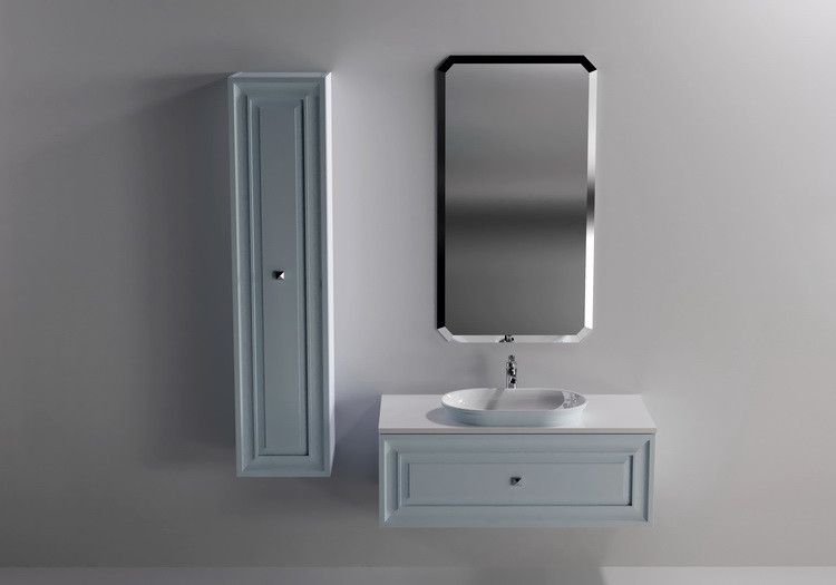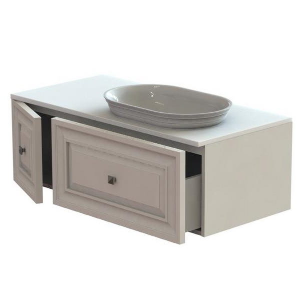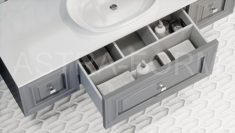 Детали фасадов мебели для ванных комнат производства компании ASTRA-FORM изготовлены из MDF. Отделка корпусных и фасадных деталей производится лакокрасочными материалами итальянского производства. Поверхность мебели может быть только матовой. Столешница и раковина изготовлены из литого мрамора. Столешницы в стандартном исполнении имеют вырезы под смеситель в штатных местах, утвержденных производителем. Раковины со столешницами поставляются в смонтированном виде.