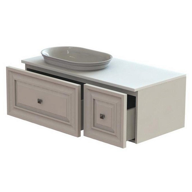 Детали фасадов мебели для ванных комнат производства компании ASTRA-FORM изготовлены из MDF. Отделка корпусных и фасадных деталей производится лакокрасочными материалами итальянского производства. Поверхность мебели может быть только матовой. Столешница и раковина изготовлены из литого мрамора. Столешницы в стандартном исполнении имеют вырезы под смеситель в штатных местах, утвержденных производителем. Раковины со столешницами поставляются в смонтированном виде.