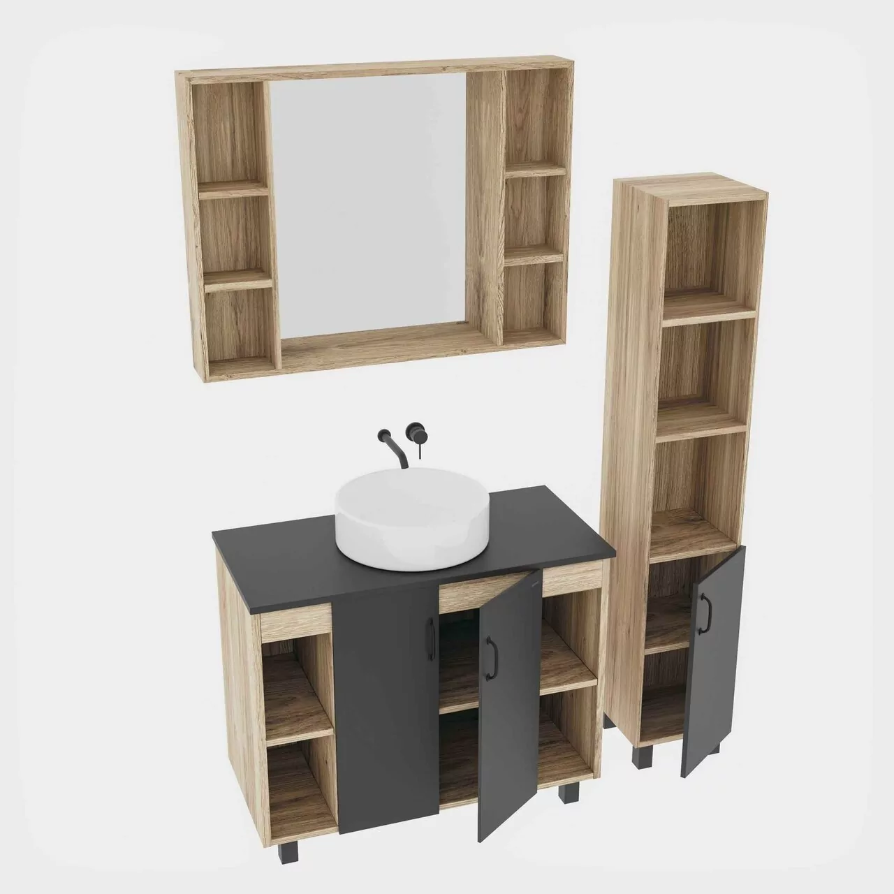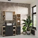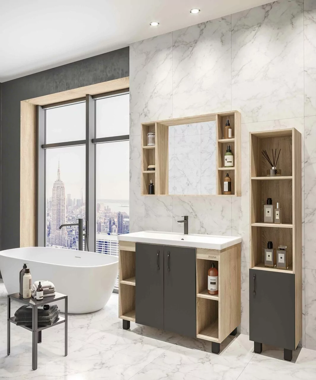 В тумбе Флай 100 сочетаются контрастные цвета и фактуры: белый матовый фасад с покрытием SoftTouch, корпус цвета дуба с текстурой, черная матовая фурнитура. Открытые полки справа обеспечивают быстрый доступ к аксессуарам, а пространство за распашной дверцей, снабженной системой плавного закрывания, станет удобным местом для хранения бытовых принадлежностей.