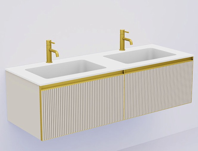 Тумба под двойную раковину/ столешницу с подсветкой Armadi Art Quatro M2 140 (70+70) см рифл CASHMERE профиль MATT GOLD 790-M2-140(70+70)-R-C-M+L