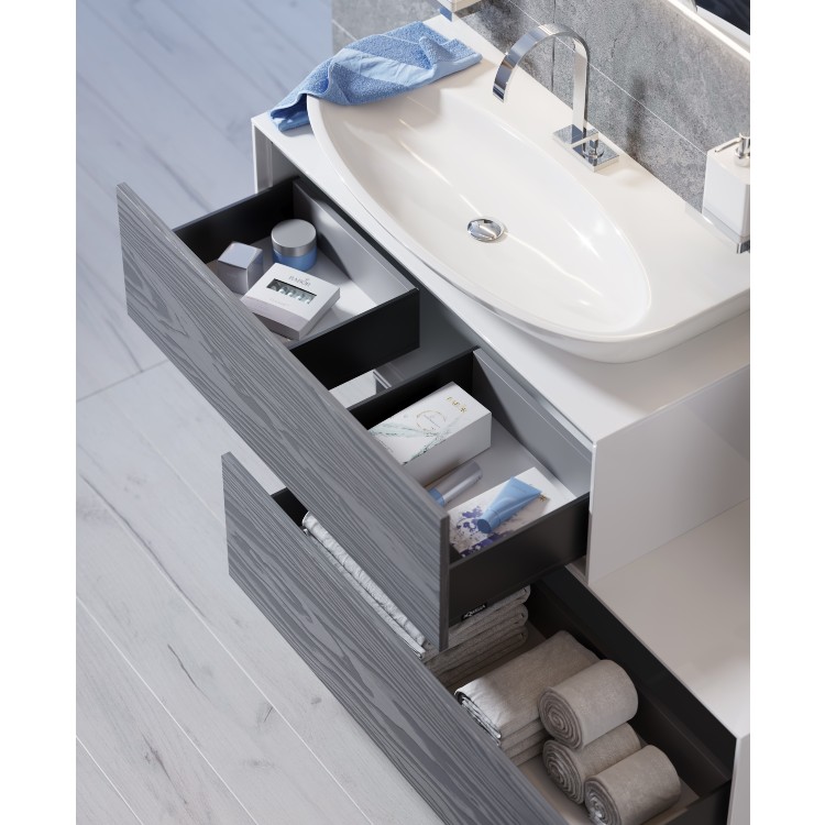 - Доступные цвета фасадов мебели: белый глянец (W) – фасады из МДФ покрыты эмалью; миллениум серый (MG) – фасады из ДСП с глубокой фактурой дерева от известнейшего итальянского производителя Cleaf.