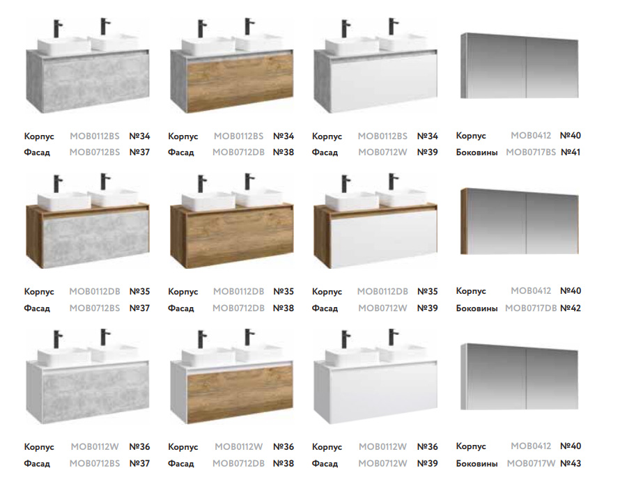 Гарнитуры Mobi выпускаются в четырёх размерах: 60, 80, 100 и 120 см. Фасады, боковины и столешницы из МДФ толщиной всего 10 мм. Коллекция гармонично вписывается в интерьер любой современной ванной комнаты. Так как существует возможность комбинировать фасады и корпуса трех цветов: бетон светлый, дуб балтийский и белый глянец. При этом умывальник может устанавливаться в любом месте, а не только центру. На тумбы 100 и 120 см можно установить один или два умывальника. Тумбы Mobi c двумя ящиками: основной и внутренний, скрытый за фасадом. Направляющие ящиков от австрийской фирмы «Blum» обеспечивают плавное и мягкое закрывание. Производитель на них даёт вечную гарантию. Внутренний ящик тумб укомплектован пластиковым разделителем для хранения различных мелочей. Независимо от цвета корпусов и фасадов внутренняя отделка ящиков комбинированная: боковины – цвет бетон светлый, дно – дуб балтийский. Конструкция тумб позволяет подвести коммуникации как из стены, так и из пола. В комплект тумб Mobi входит специальный сифон, позволяющий экономить пространство мебели. Поэтому внутренний ящик тумб полноразмерный. В зеркальных шкафах Mobi отсутствуют перегородки – это позволяет максимально использовать внутреннее пространство. Зеркальный шкаф 60 см – с одной дверью на петлях Blum с доводчиком, в остальных размерах – две двери. Боковины зеркального шкафа могут быть трёх цветов. Аналогично тумбам есть возможность комбинировать цвета корпусов и фасадов пенала. Двери пенала с системой открывания «push-to-open» (открываются нажатием). Петли австрийского производства Blum. Ширина универсального левого/правого пенала 36,5 см. Все предметы коллекции оснащены итальянскими навесами Camar, которые выдерживают нагрузку до 200 кг.