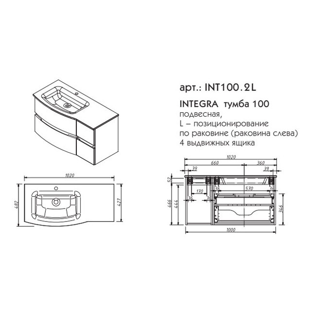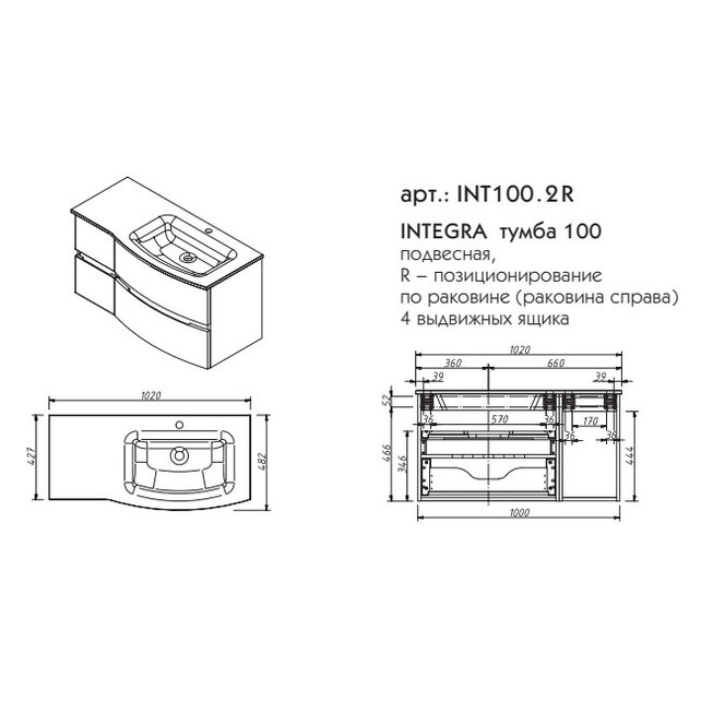 Тумба под раковину Caprigo Integra 100 см 4ящ INT100.2L/ INT100.2R цвета разные