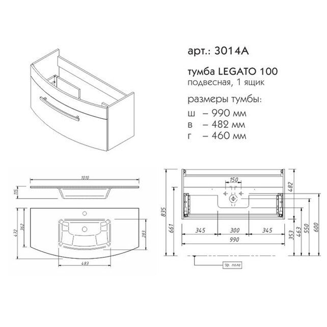 Тумба под раковину Caprigo Legato 100 см 1ящ 3014A цвета разные