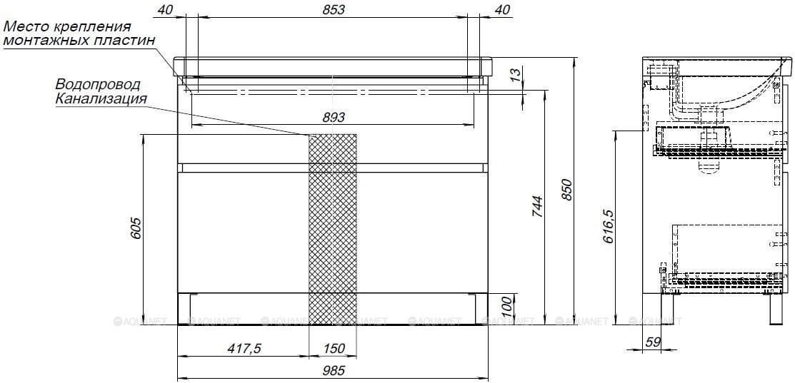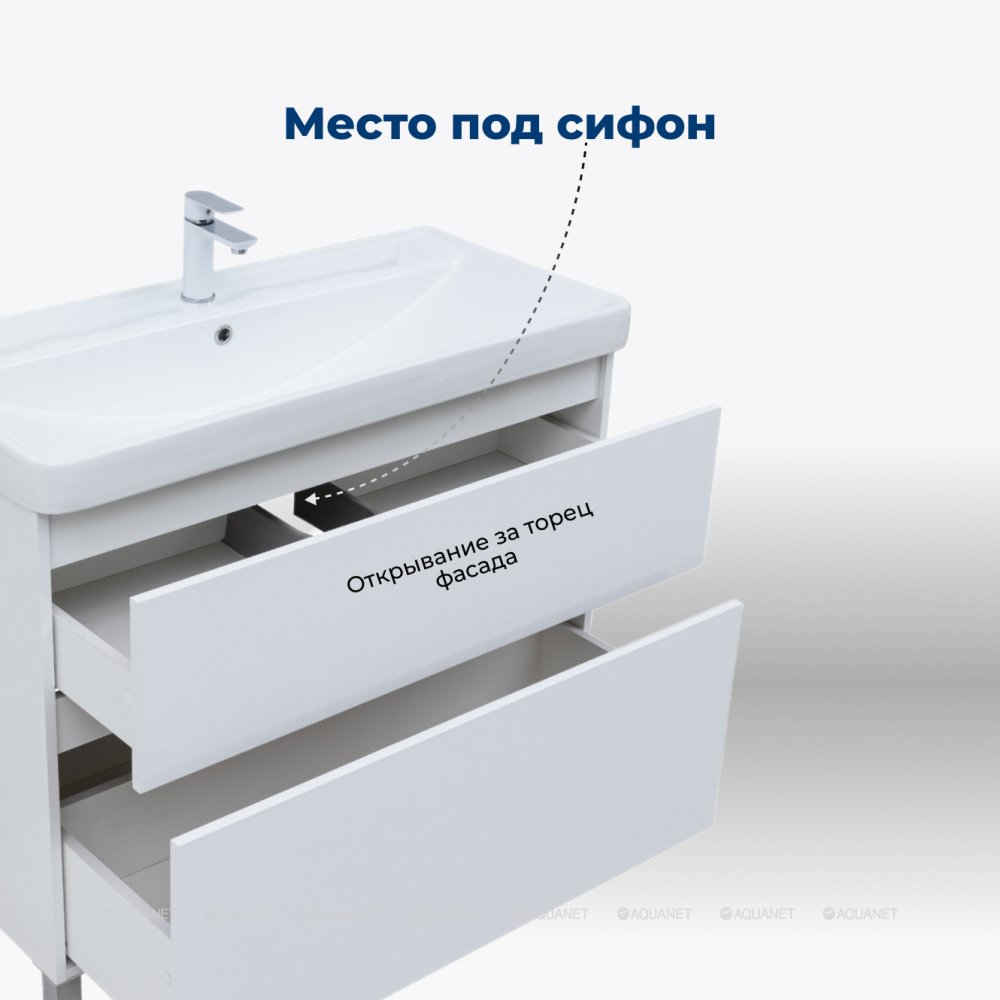 Пластиковое ограждение сифона в сером цвете аккуратно скрывает коммуникации. Прочное дно нижнего ящика, изготовленное из влагостойкой ЛДСП толщиной 16 мм, позволяет хранить даже тяжелые предметы. Предусмотренное место за нижним ящиком для подводки коммуникаций снизу упрощает монтаж и подключение сантехники. Aquanet Вега – это оптимальное решение для создания стильного и практичного интерьера ванной комнаты.
