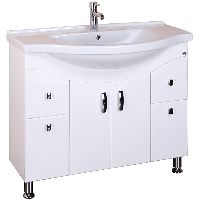 В тумбе Onika Эльбрус 100 белоснежный глянец фасада подчеркивается оригинальной хромированной фурнитурой и сложной изысканной геометрией линий. Современный функционал и огромное внутреннее пространство тумбы позволяет удобно расположить все необходимое: по центру тумбы 2 распашных двери скрывают большое отделение для крупных предметов, а по бокам 2 ниши за распашными дверцами и 2 выдвижных ящика созданы для хранения небольших вещей. Ящики тумбы оснащены направляющими полного выдвижения, а дверцы снабжены системой плавного закрывания. Корпус тумбы выполнен из ЛДСП, фасад - из ЛМДФ в пленке, устойчивых к механическим воздействиям, перепадам температур и высокой влажности. Шесть хромированных ручек и пять ножек (2 декоративных хромированных и 3 пластиковых) идут в комплекте с тумбой.