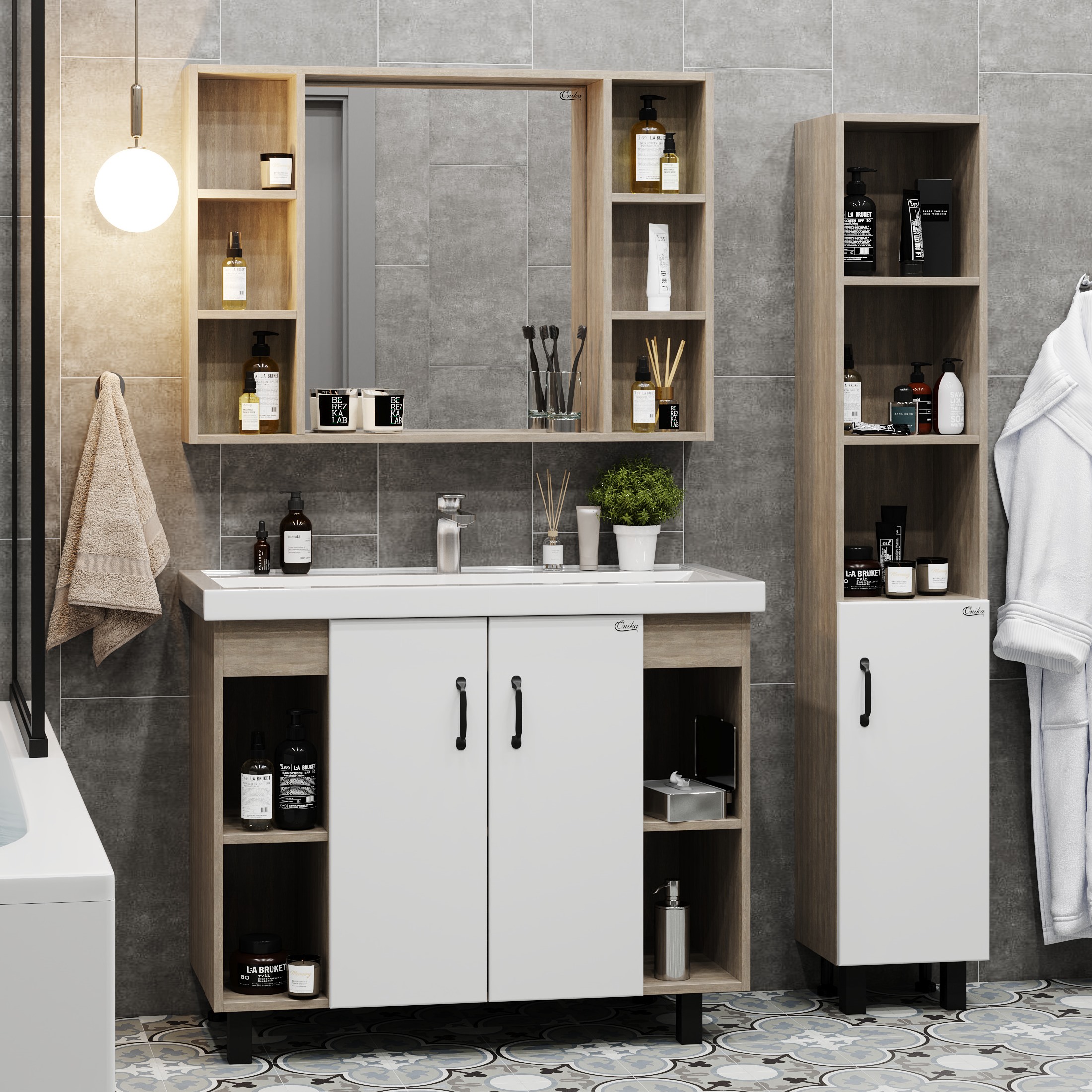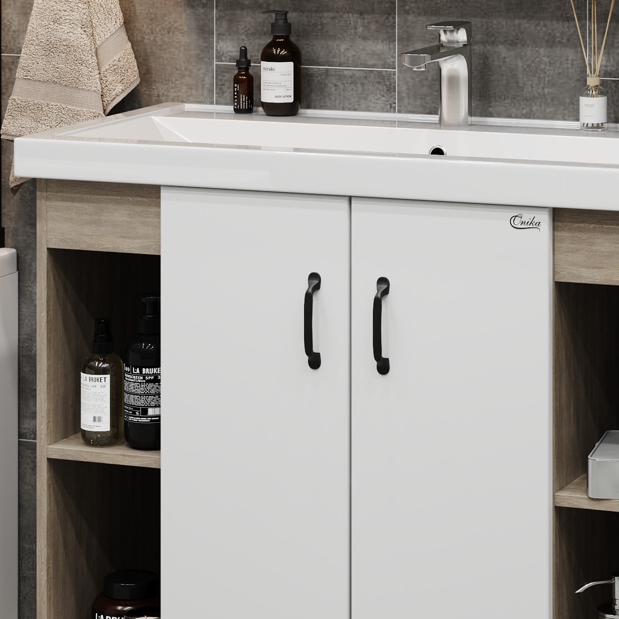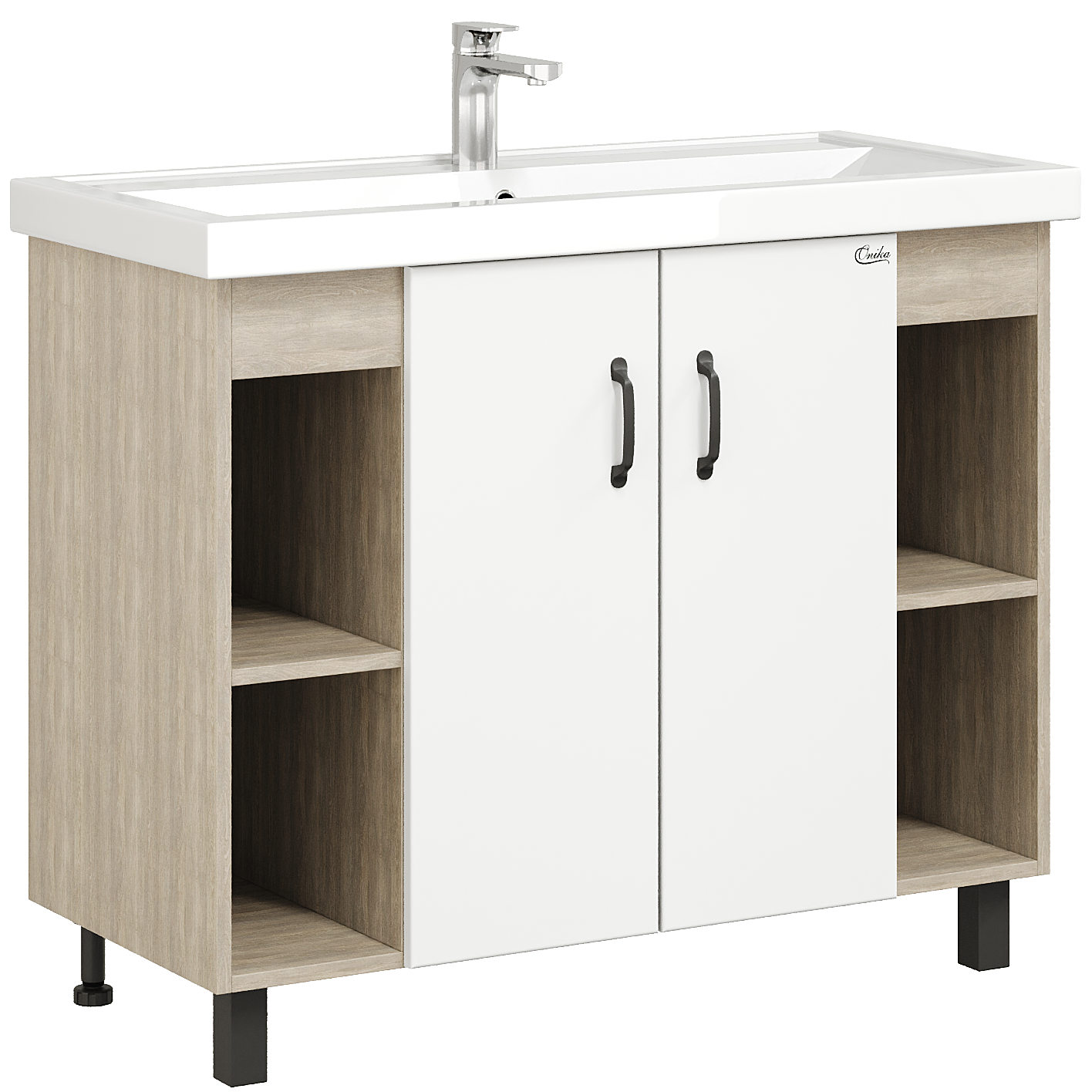 В тумбе Onika Тимбер 100 удачно сочетаются контрастные цвета и фактуры: белый матовый фасад с покрытием SoftTouch, корпус цвета дуба с роскошной текстурой, черная матовая металлическая фурнитура. Открытые полки по бокам от основного отделения обеспечивают быстрый доступ к часто используемым аксессуарам, а пространство за распашными дверцами с доводчиками по центру тумбы, станет удобным местом для хранения различных бытовых принадлежностей. Корпус тумбы выполнен из ЛДСП, фасад - из ЛМДФ в пленке, устойчивых к механическим воздействиям, перепадам температур и высокой влажности. 2 черных металлических ручки и 4 ножки (2 декоративных черных и 2 пластиковых) идут в комплекте с тумбой.