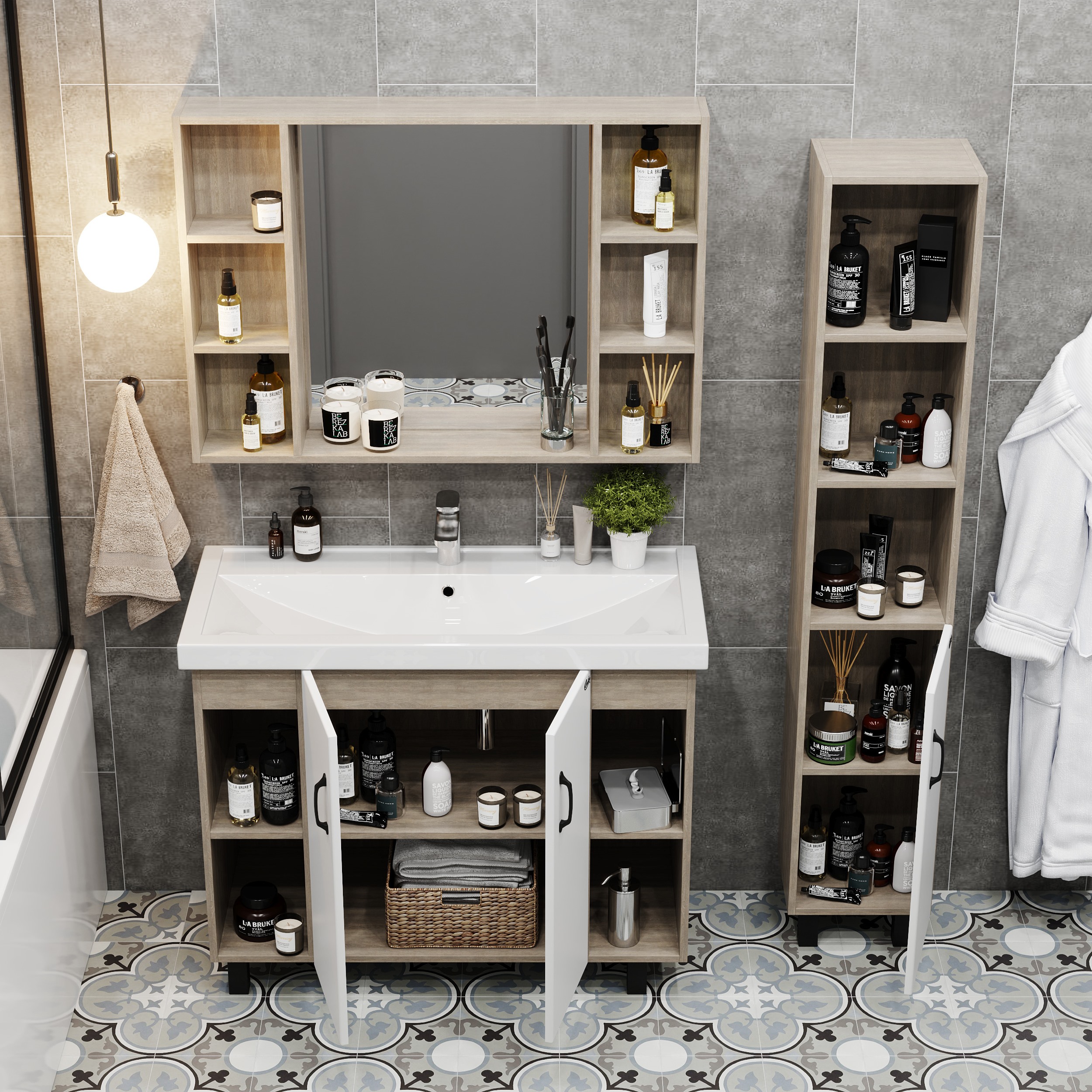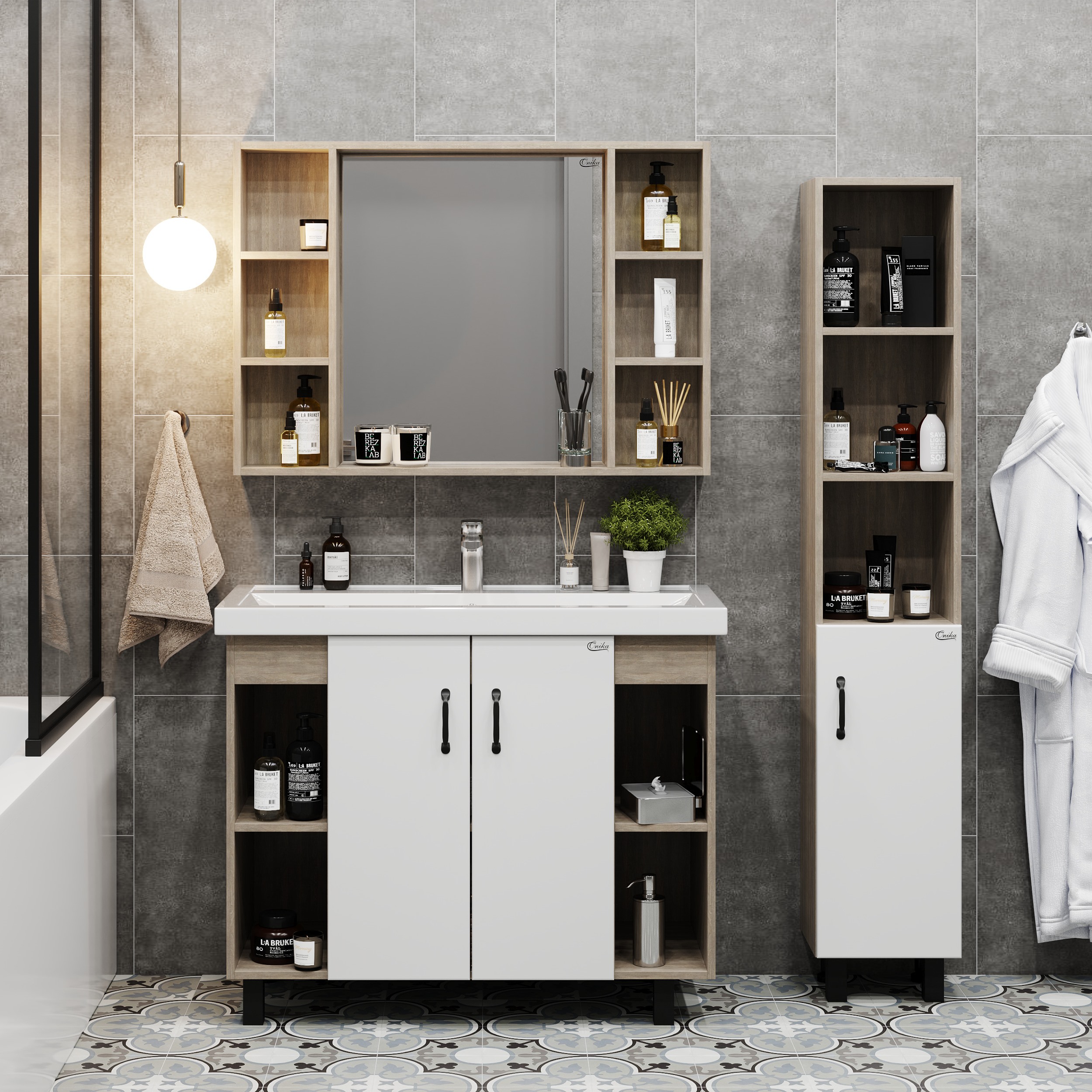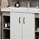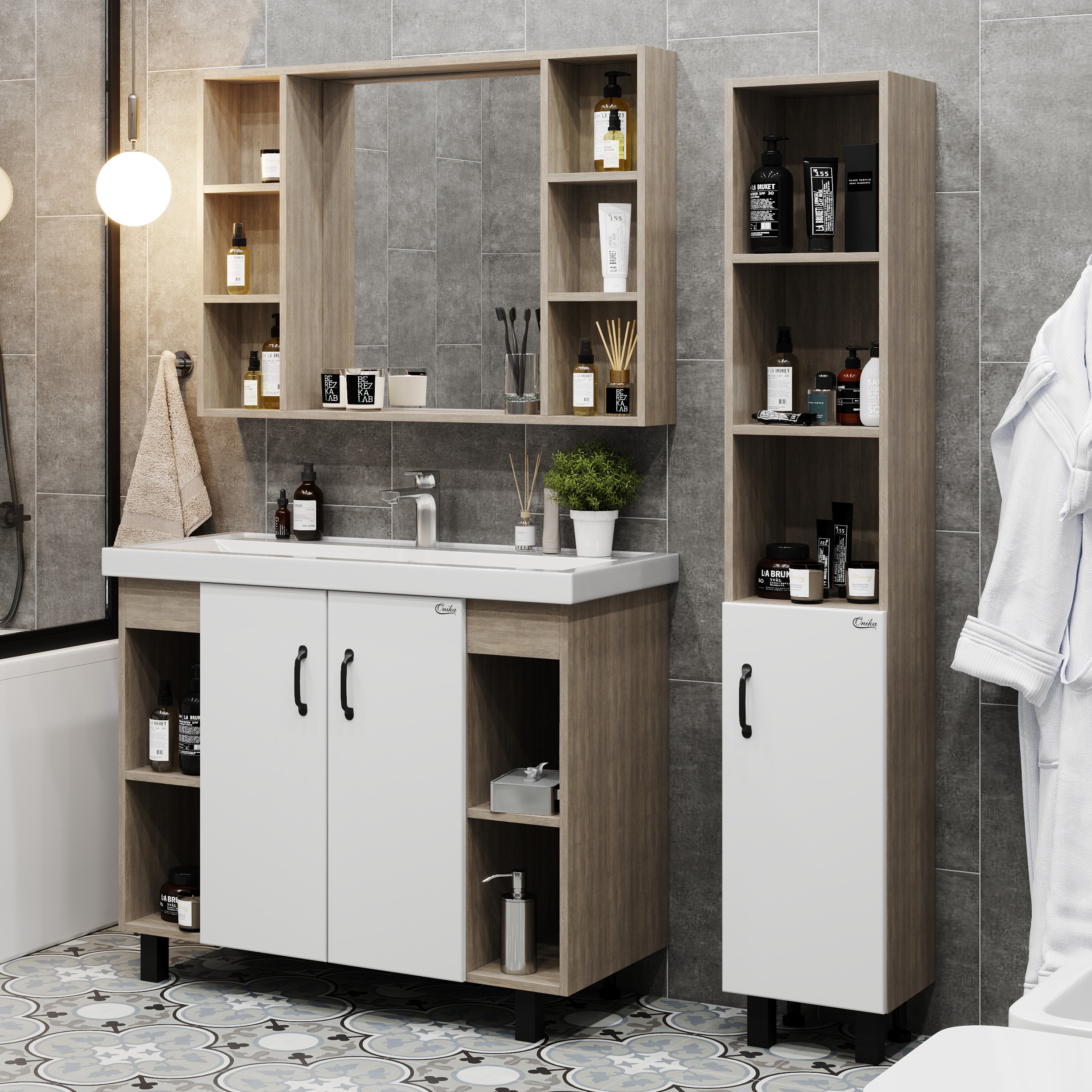 В тумбе Onika Тимбер 100 удачно сочетаются контрастные цвета и фактуры: белый матовый фасад с покрытием SoftTouch, корпус цвета дуба с роскошной текстурой, черная матовая металлическая фурнитура. Открытые полки по бокам от основного отделения обеспечивают быстрый доступ к часто используемым аксессуарам, а пространство за распашными дверцами с доводчиками по центру тумбы, станет удобным местом для хранения различных бытовых принадлежностей. Корпус тумбы выполнен из ЛДСП, фасад - из ЛМДФ в пленке, устойчивых к механическим воздействиям, перепадам температур и высокой влажности. 2 черных металлических ручки и 4 ножки (2 декоративных черных и 2 пластиковых) идут в комплекте с тумбой.