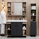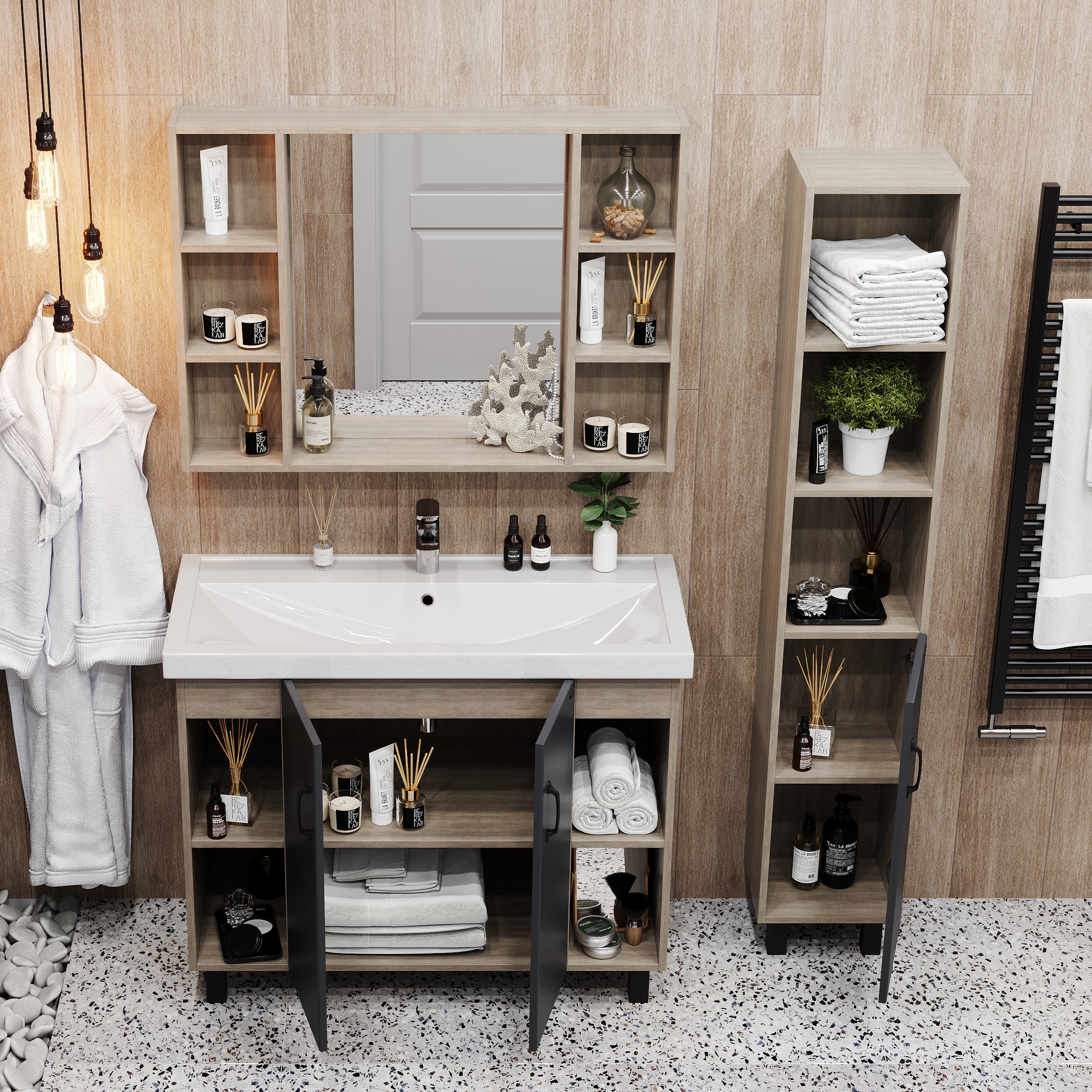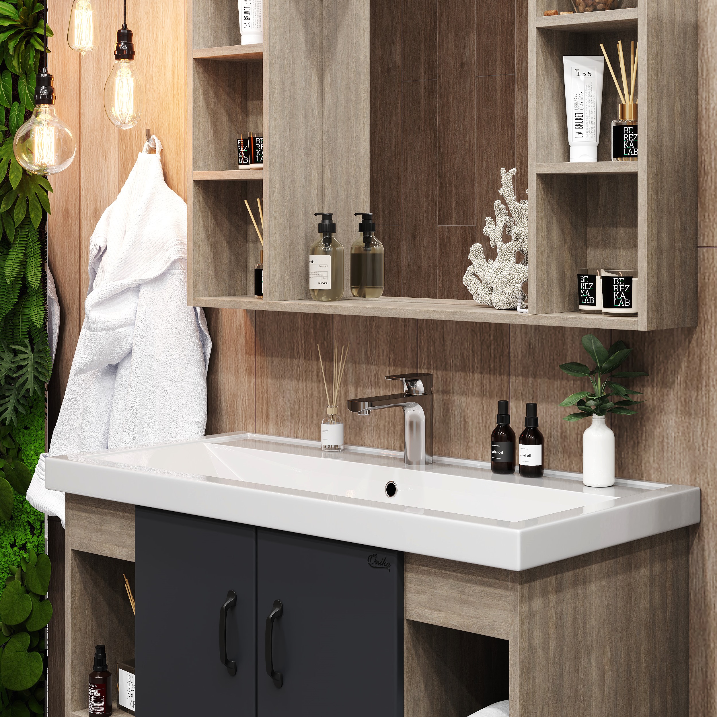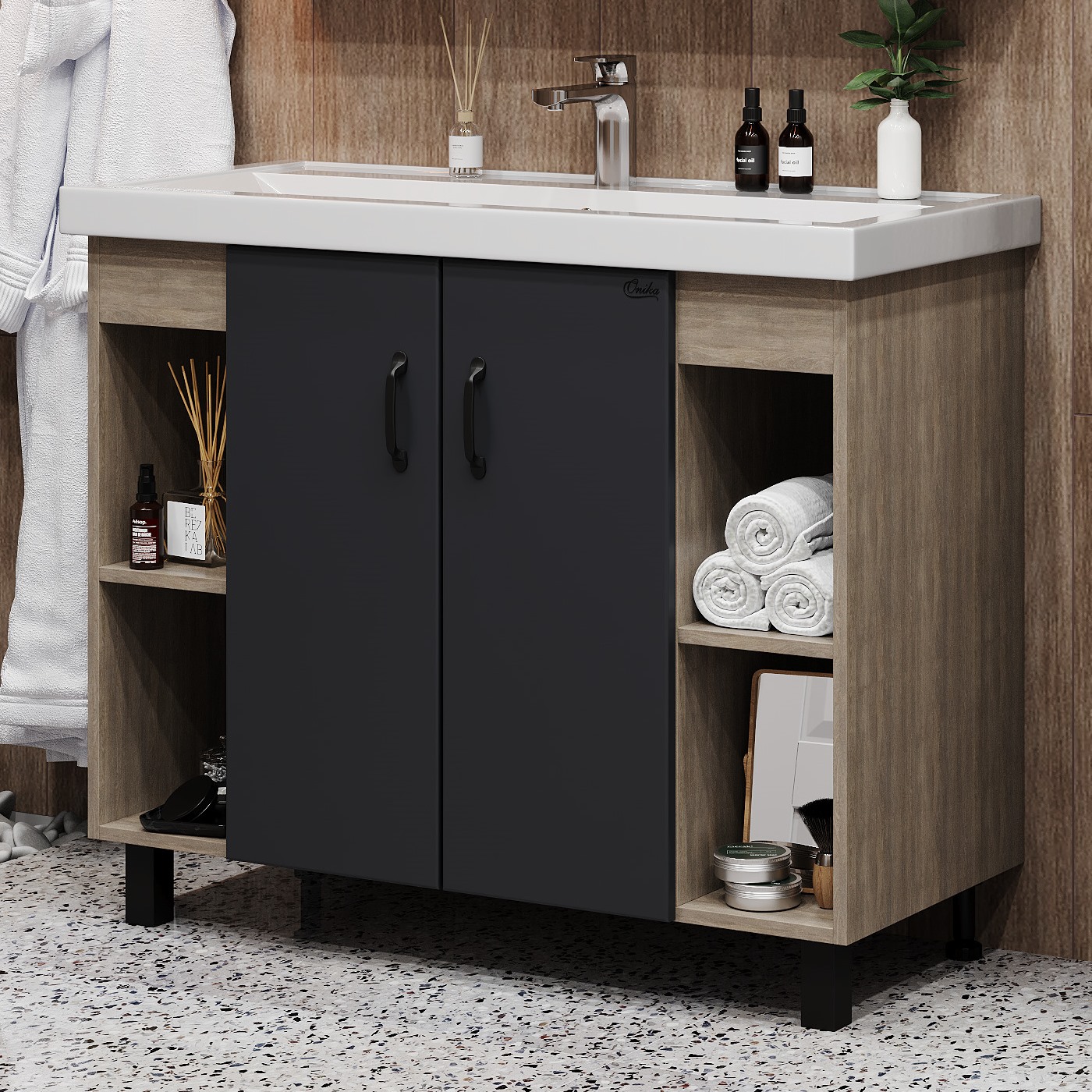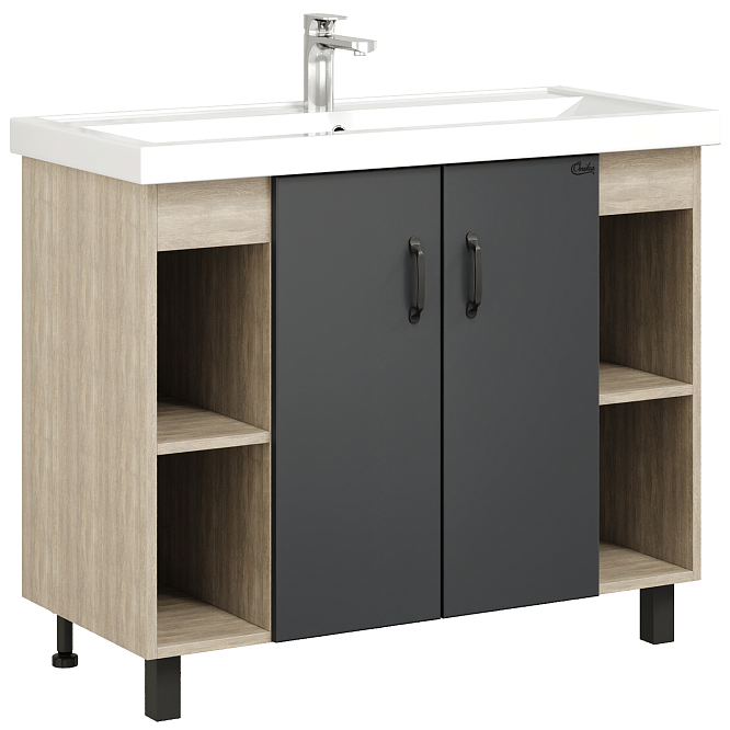 В тумбе Onika Тимбер 100 удачно сочетаются контрастные цвета и фактуры: серый матовый фасад с покрытием SoftTouch, корпус цвета дуба с роскошной текстурой, черная матовая металлическая фурнитура. Открытые полки по бокам от основного отделения обеспечивают быстрый доступ к часто используемым аксессуарам, а пространство за распашными дверцами с доводчиками по центру тумбы, станет удобным местом для хранения различных бытовых принадлежностей. Корпус тумбы выполнен из ЛДСП, фасад - из ЛМДФ в пленке, устойчивых к механическим воздействиям, перепадам температур и высокой влажности. 2 черных металлических ручки и 4 ножки (2 декоративных черных и 2 пластиковых) идут в комплекте с тумбой.
