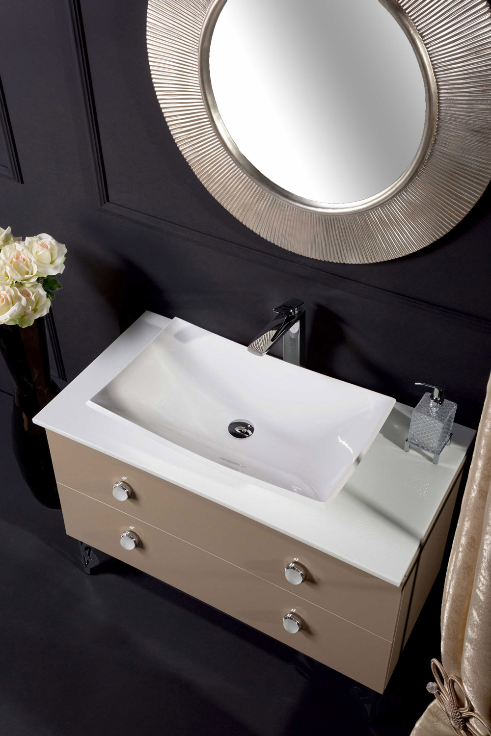 Цветовая гамма коллекции представлена глянцевым белым, глянцевым капучино, глянцевым коричневым и цветом Black wood, под заказ возможно исполнение в глянцевом черном цвете. Размерный ряд коллекции NeoArt состоит из 80 см, 100 см, 110 см и 140 см (на 2 чаши-раковины). В коллекции NeoArt используется ультраглянцевый акриловый МДФ от австрийского производителя Senosan, не только имеющий глубокий и насыщенный цвет, но и позволяющий изделиям служить долгое время несмотря на влажную среду.). Дно ящиков отделано эко-кожей с фирменным стежком Antonio Valanti. Столешницы выполнены как из керамики и каленого стекла, так и материала Solid Glass®, в состав которого входит мраморная крошка и стекло, материал чрезвычайно прочен, не оставляет следов царапин и обладает неповторимой глубиной цвета. Эксклюзивная линейка раковин данной коллекции вряд ли оставит равнодушными даже самых притязательных клиентов. Некоторые из них производятся по оригинальным лекалам из материала Corian®, другие из чистейшего горного хрусталя, с оптимальным содержанием окиси свинца (PbO), не менее 24%. Произведенные в Италии ручки, покрыты позолотой 24Карат. Дно выдвижных ящиков покрыто кожей с маркировкой Antonio Valanti. В изделиях используется фурнитура от мирового лидера Hettich®.