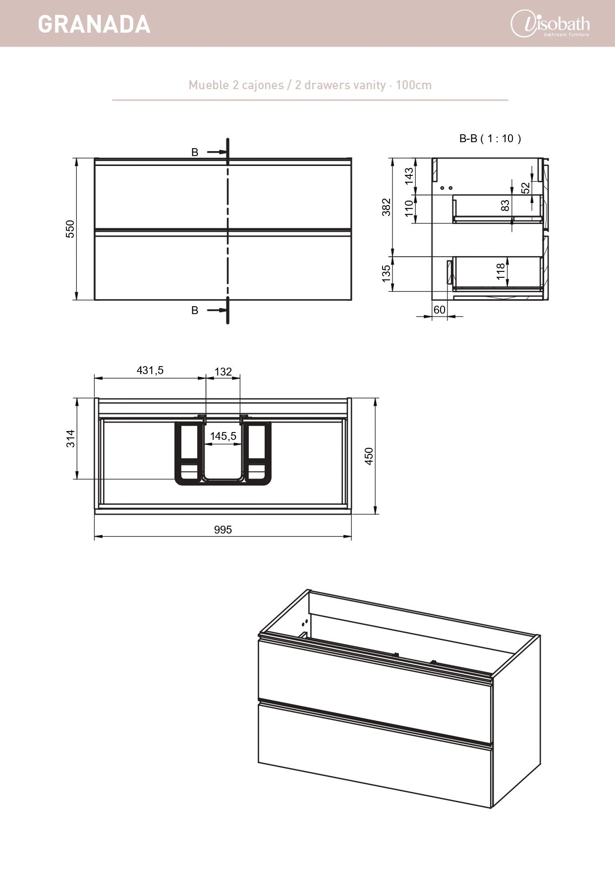 Тумба под раковину Visobath Granada 100 см 2ящ бежевый матовый Cotton 70456/87605