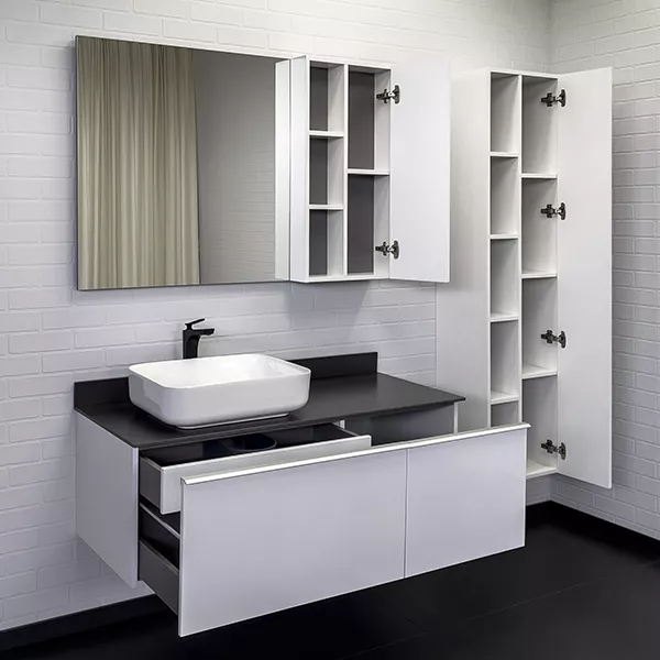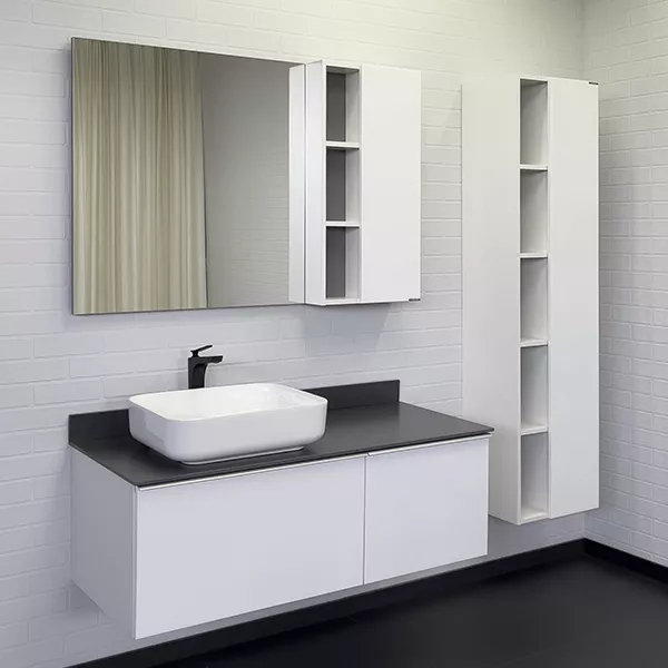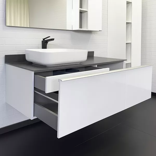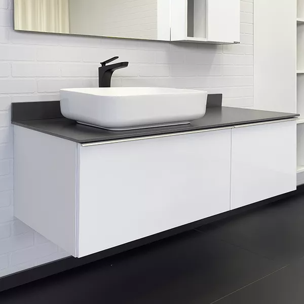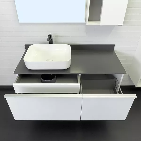 Тумба с раковиной Comfortу Милан 120 см подвесная, белый глянец, со столешницей цвета графит, раковина Comfortу T-Y9378 белая. Широкая подвесная тумба-умывальник в современном стиле с двумя выкатными ящиками. Ящики оснащены системой с плавным закрыванием. За правым фасадом скрывается внутренний ящик оснащенный системой push-to-open (открытие при нажатии). Тумба укомплектована столешницей и плинтусом из керамогранита цвета графит и накладной прямоугольной раковиной. Фасады покрыты белой глянцевой эмалью. Тумба подготовлена для подключения водоснабжения снизу.