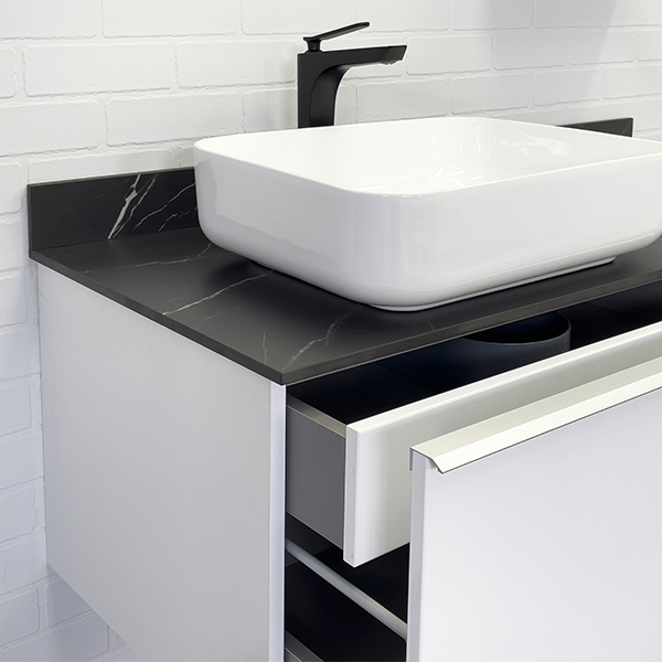 Тумба с раковиной Comfortу Милан 120 см подвесная, белый глянец, со столешницей под мрамор Калакатта Блэк, раковина Comfortу белая. Широкая подвесная тумба-умывальник. Организация хранения: два ящика с системой плавного закрывания. Ящики оснащены системой с плавным закрыванием. За правым фасадом скрывается внутренний ящик оснащенный системой push-to-open (открытие при нажатии). Тумба укомплектована столешницей и плинтусом из керамогранита под мрамор Калакатта Блэк и накладной прямоугольной раковиной. Фасады покрыты белой глянцевой эмалью. Тумба подготовлена для подключения водоснабжения снизу.