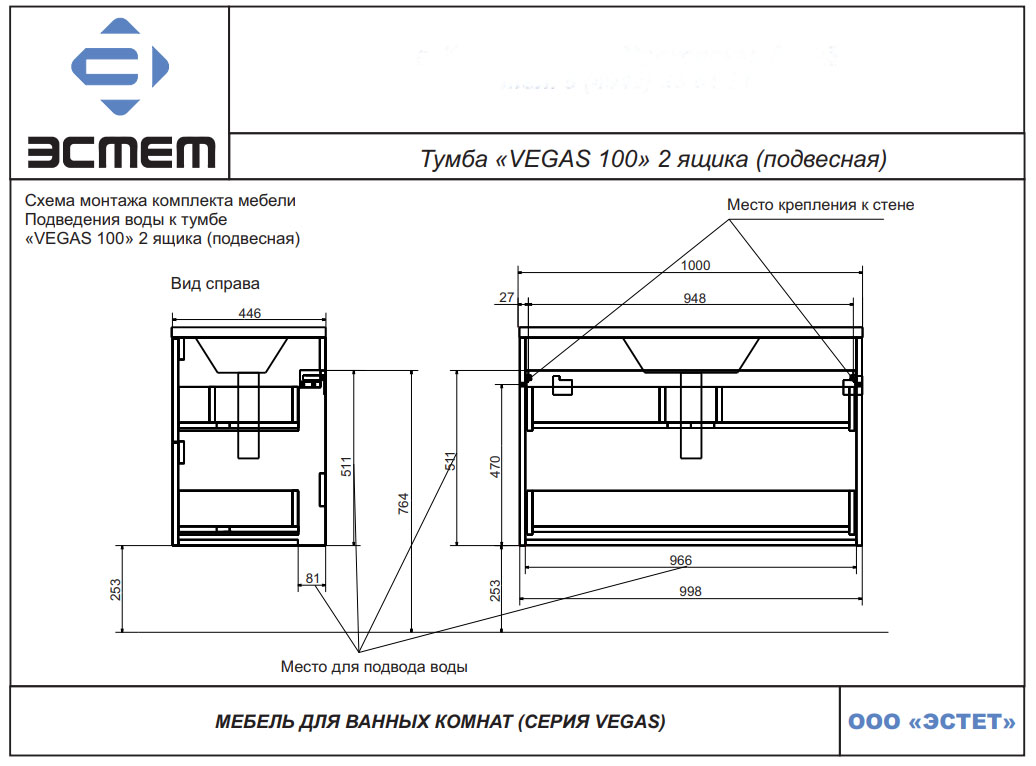 Тумба с раковиной Эстет Vegas 100 см ФР-00003486