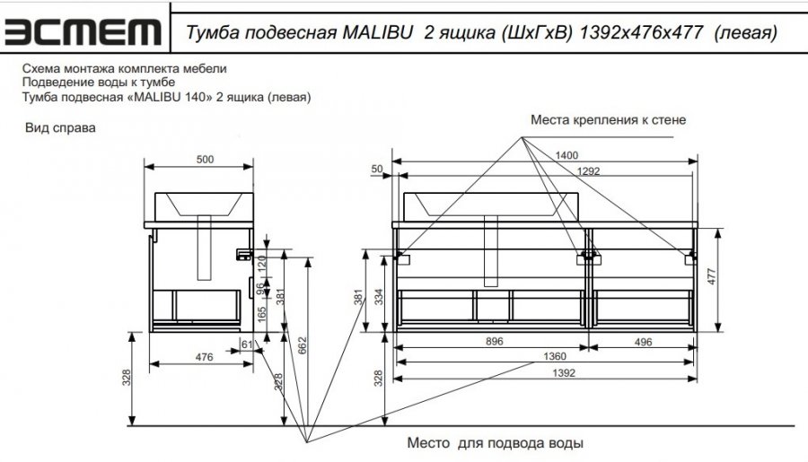 | Монтаж | Подвесной, правый/левый |