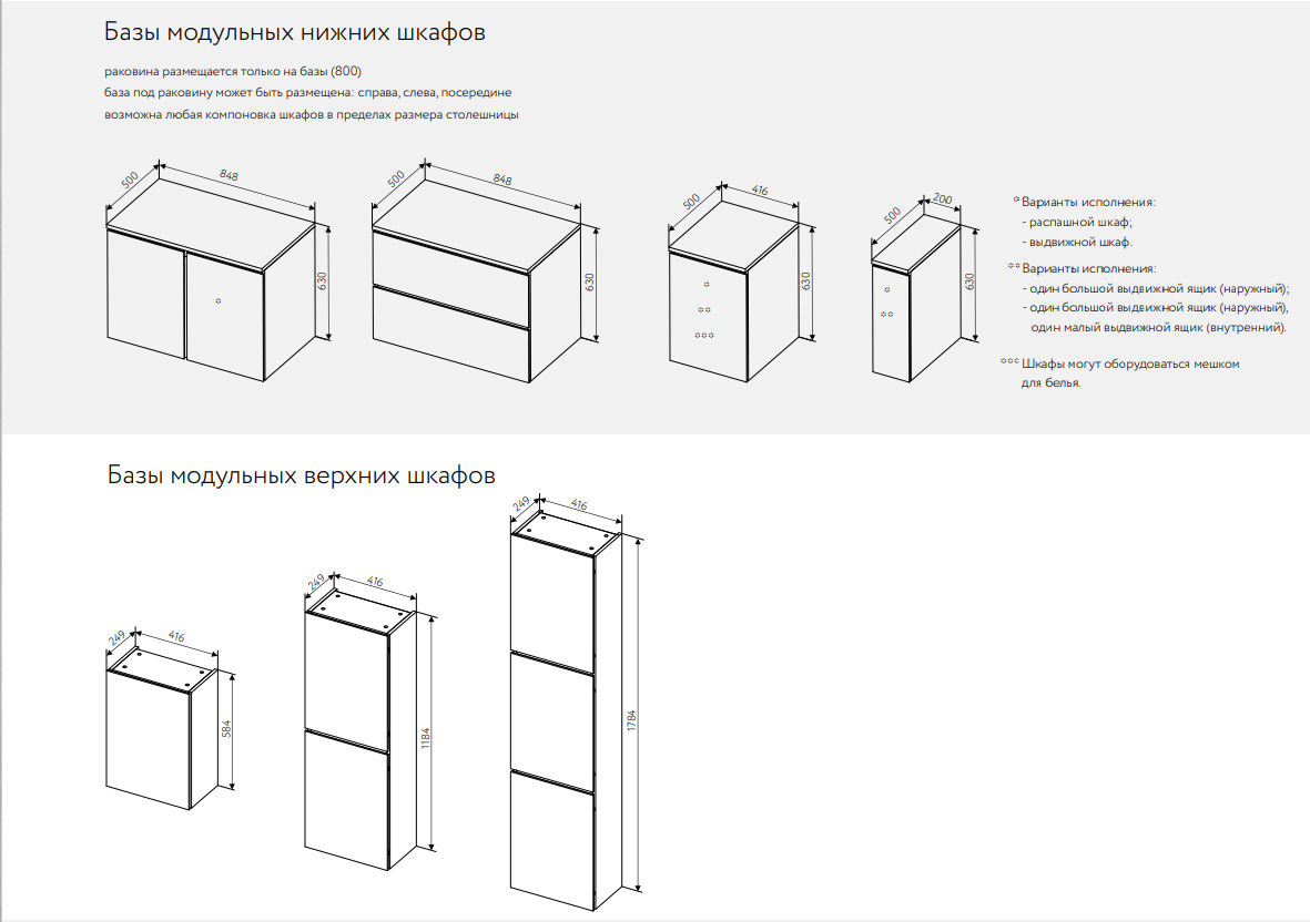 Возможна любая компоновка шкафов в пределах размера столешницы