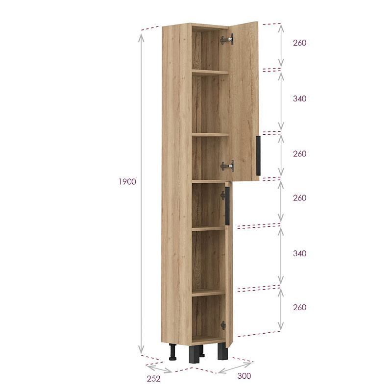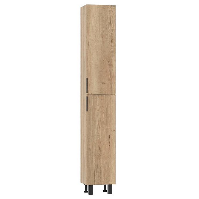 Напольный пенал для ванной комнаты Onika ЛЕГРАН 30 - это сочетание насыщенного древесного декора и благородства металла: роскошная текстура и натуральный цвет дуб галифакс дают теплоту, а матовая металлическая ручка добавляет урбанизма и солидности. Пенал имеет универсальную ориентацию: при установке верх и низ пенала можно менять местами, а дверцы могут открываться как влево, так и вправо. Внутреннее пространство пенала поделено полками на 6 секций с возможностью регулировки по высоте, что позволяет удобно разместить различные косметические средства. Дверь снабжена механизмом плавного закрывания. Пенал выполнен из ЛДСП, устойчивой к механическим воздействиям, перепадам температур и высокой влажности. 2 металлических черных матовых ручки и 4 ножки (2 металлических + 2 пластиковых) - в комплекте.