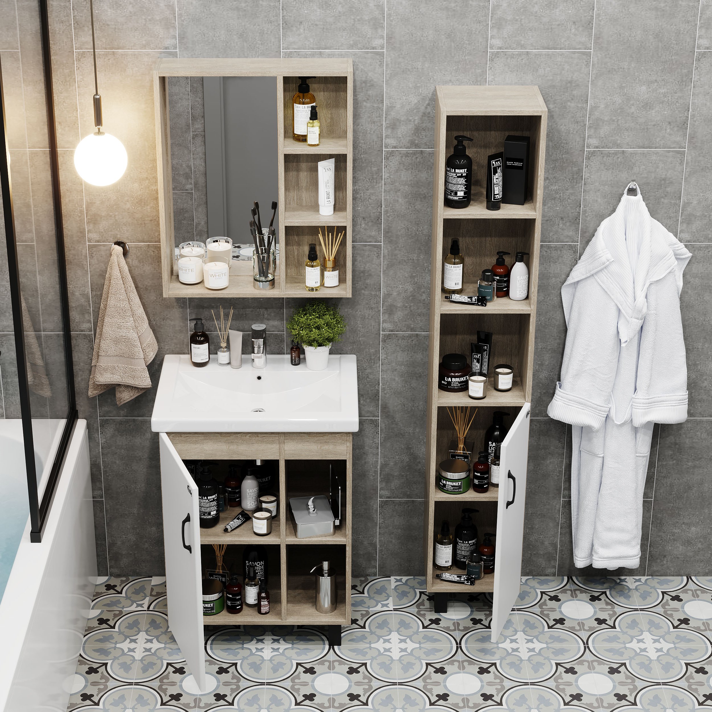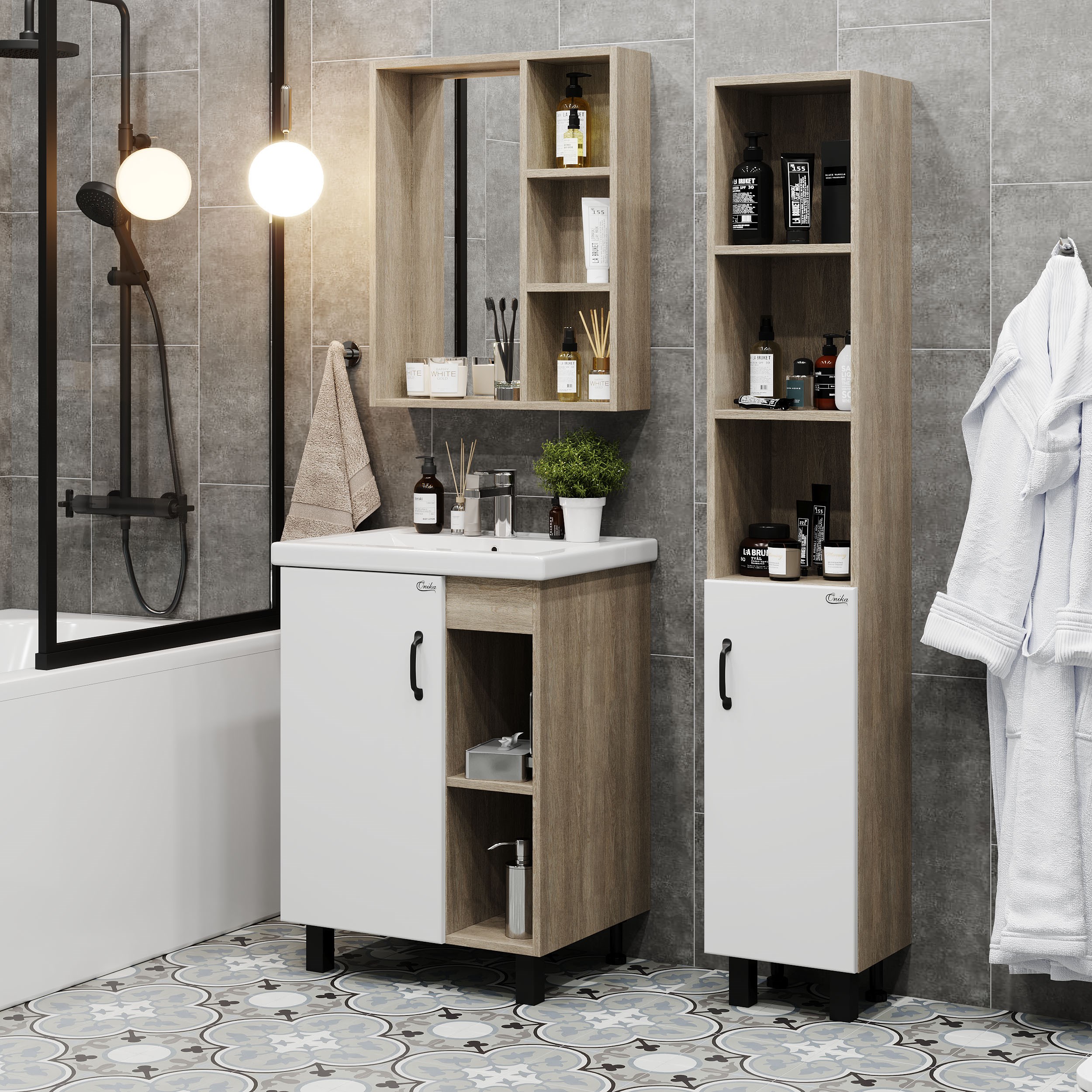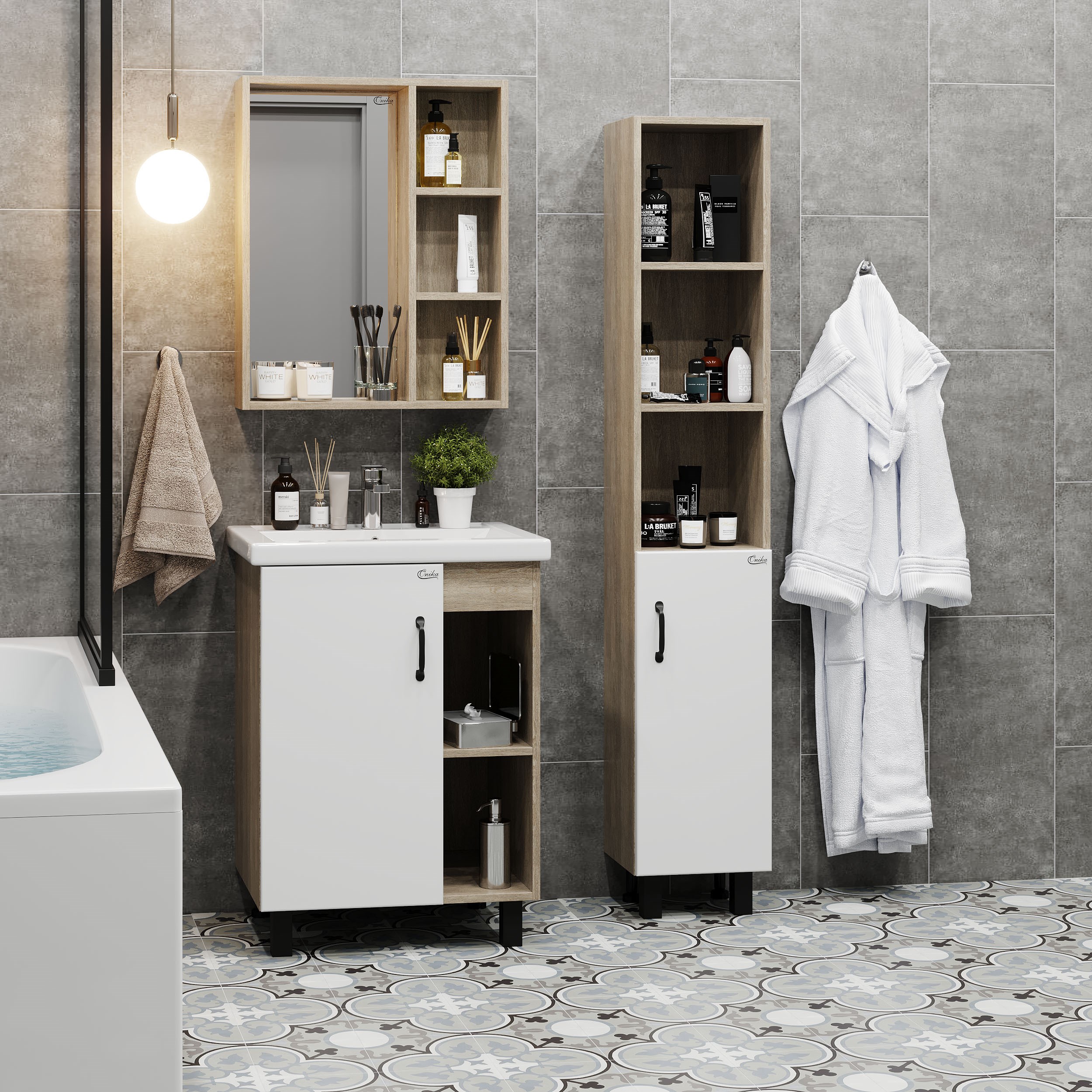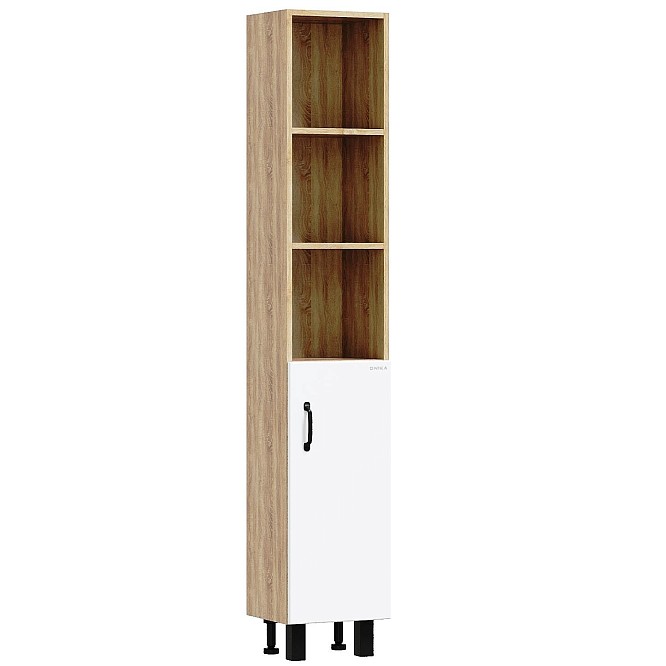 Напольный пенал для ванной комнаты пенал Onika ТИМБЕР 30 удачно сочетает в себе контрастные цвета и фактуры: белый матовый фасад с покрытием SoftTouch, корпус цвета дуб сонома с роскошной текстурой, черная матовая металлическая фурнитура. Открытые полки сверху обеспечивают быстрый доступ к часто используемым аксессуарам, а пространство за распашной дверцей снизу, снабженной системой плавного закрывания, станет удобным местом для хранения различных бытовых принадлежностей. Корпус пенала выполнен из ЛДСП, фасад - из МДФ в пленке, устойчивых к механическим воздействиям, перепадам температур и высокой влажности. Черная металлическая ручка и 4 ножки (2 декоративных черных и 2 пластиковых) идут в комплекте с пеналом.