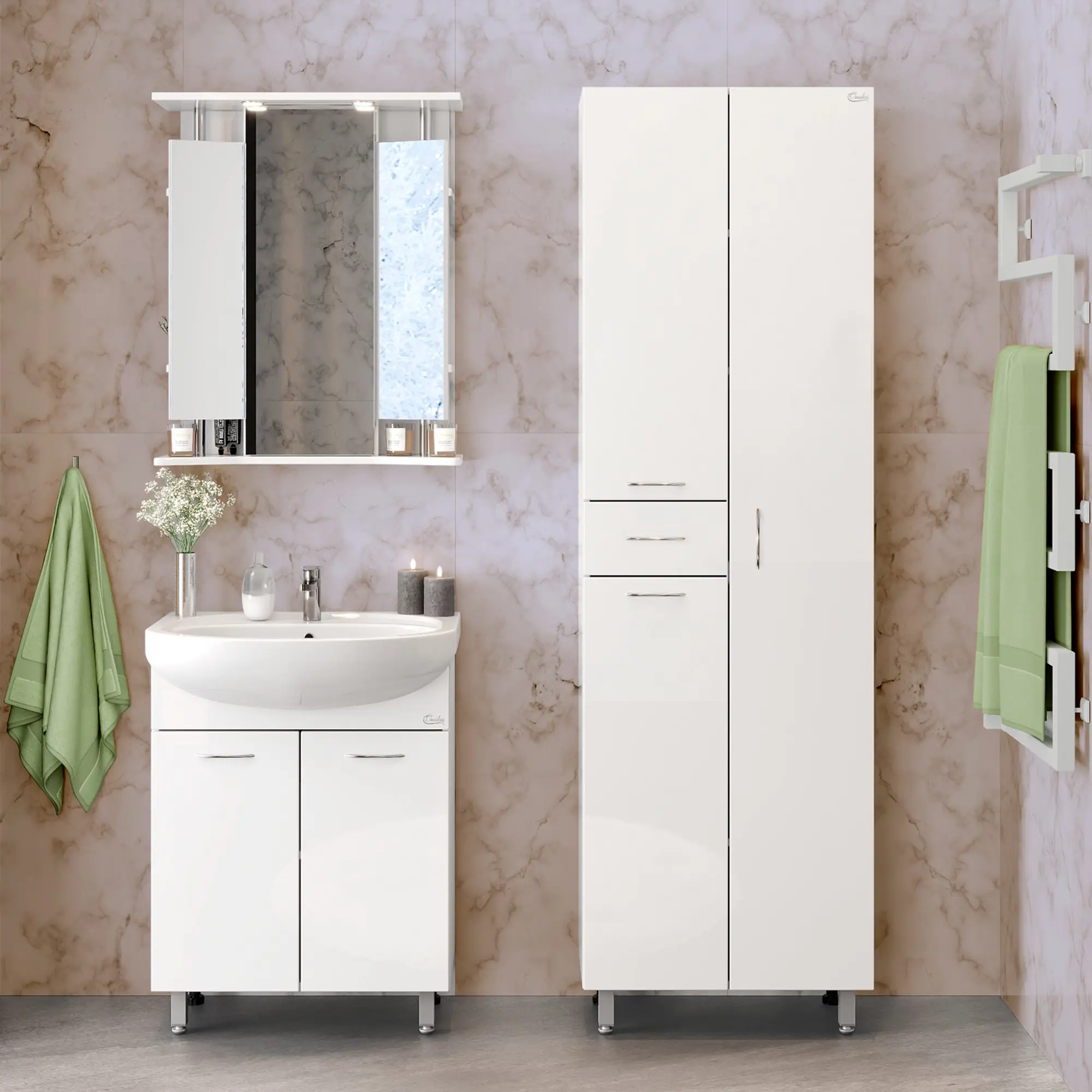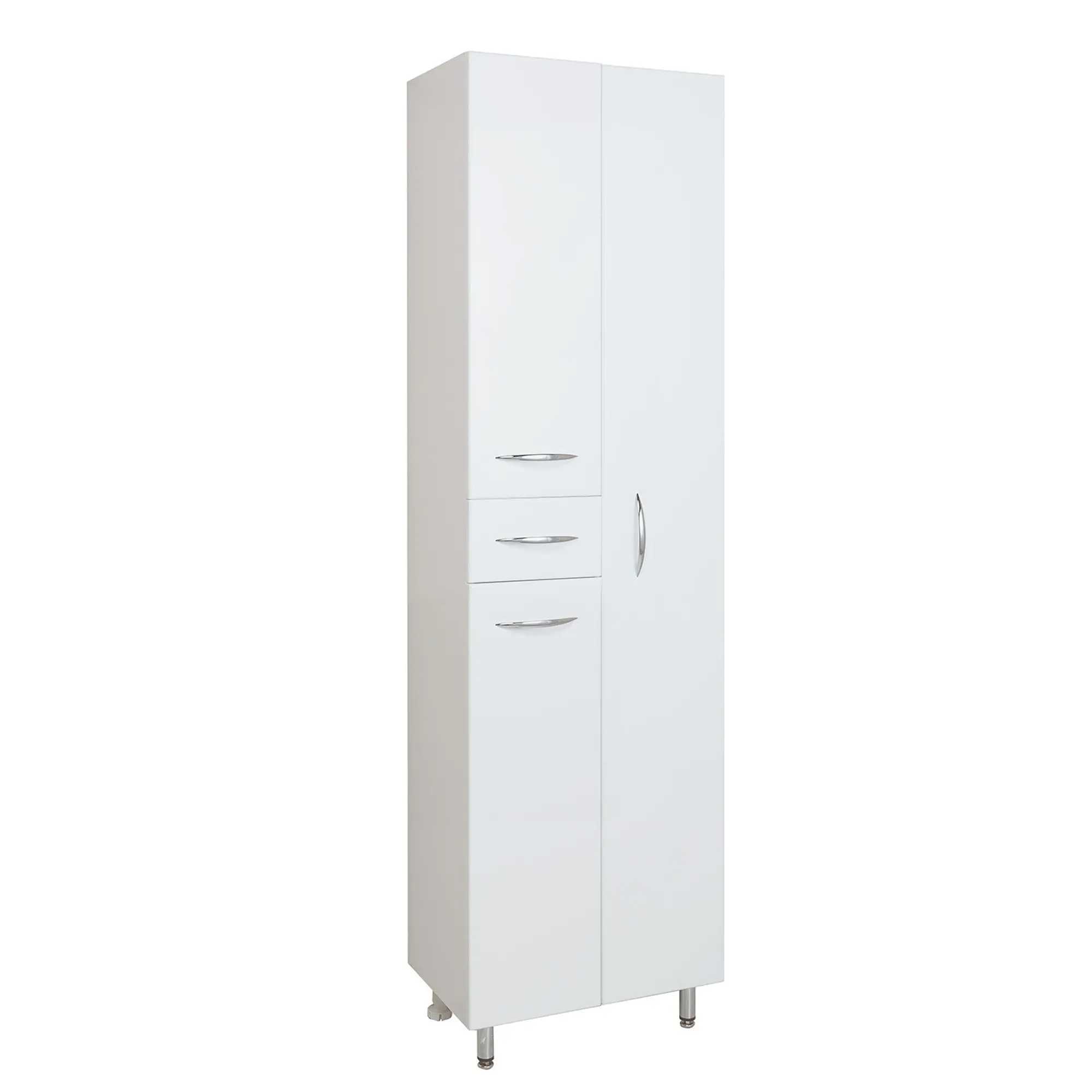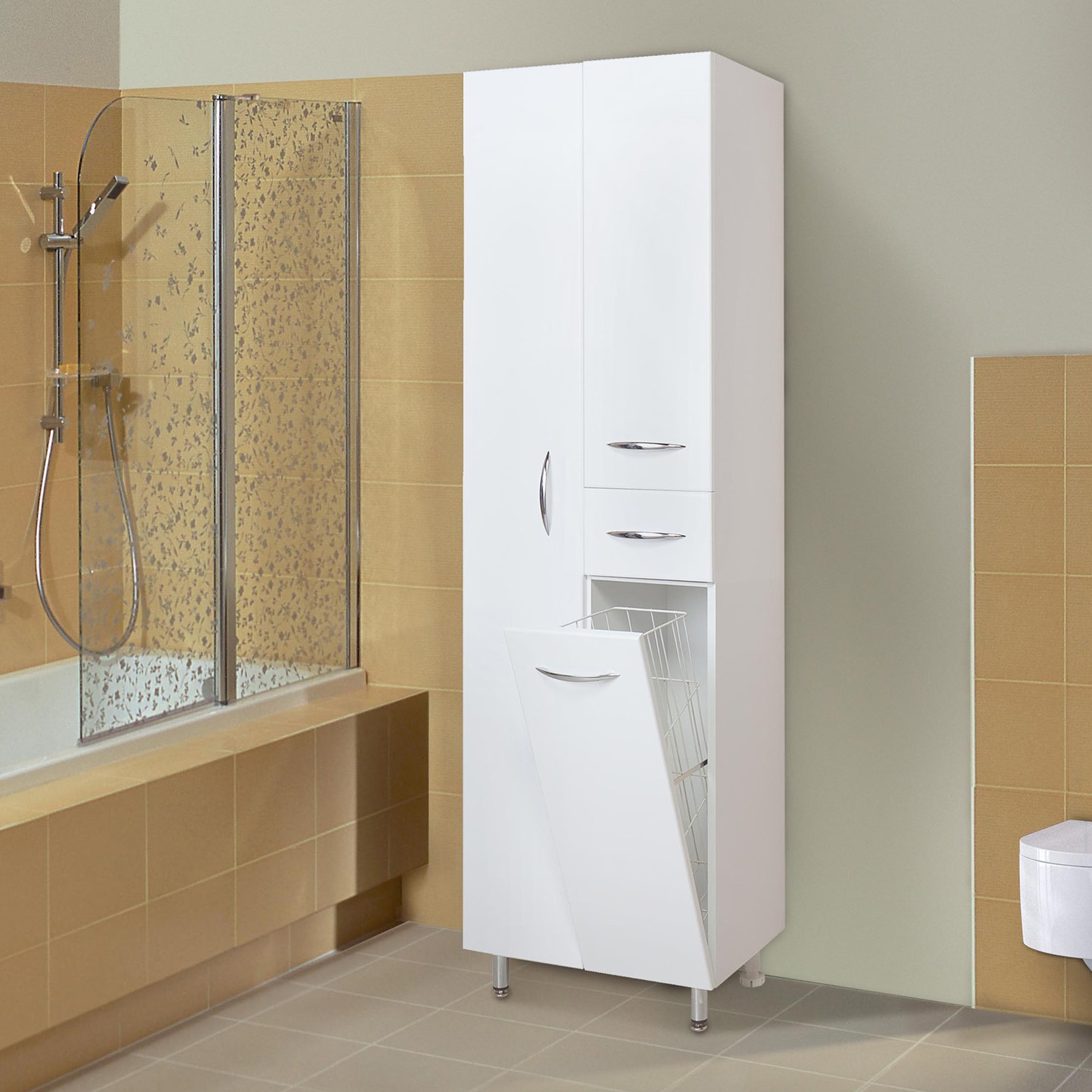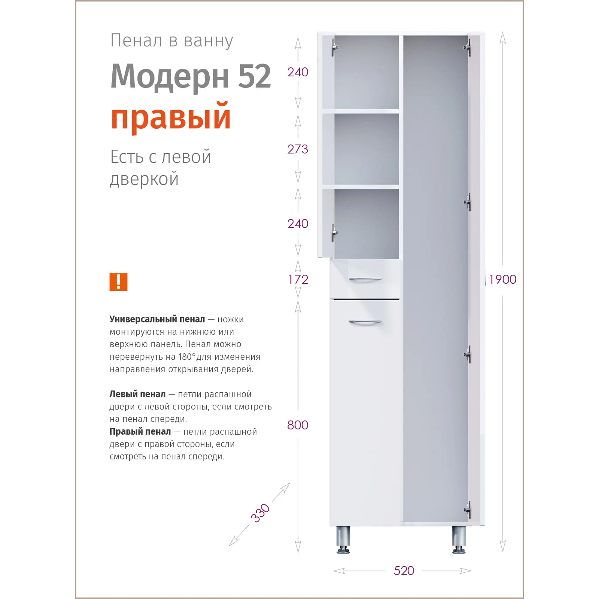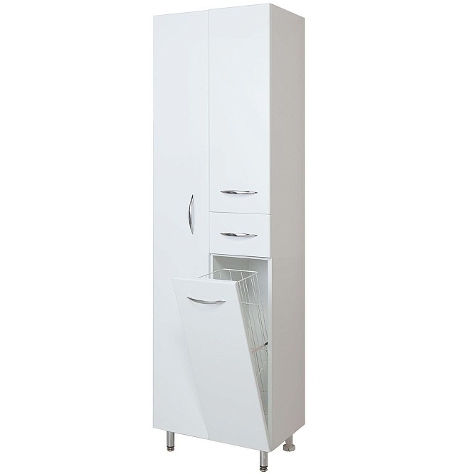 Напольный пенал для ванной комнаты с корзиной для белья Onika МОДЕРН 52, благодаря простому минималистичному дизайну и белому глянцевому фасаду, подойдет под любой интерьер ванной комнаты. Конструкция пенала предусмотрела огромное пространство для хранения, в котором поместятся все необходимые вещи: с одной стороны - большое отделение сверху, небольшой выдвижной ящик посередине и отделение с корзиной для белья снизу, с другой - место для хранения халатов. Размер бельевой корзины: 180*240*650. Дверцы оснащены механизмом плавного закрывания, а ящик - направляющими полного выдвижения. Корпус пенала выполнен из ЛДСП, фасад - из МДФ в пленке, устойчивых к механическим воздействиям, перепадам температур и высокой влажности. В комплекте - 4 хромированные ручки и ножки: 2 декоративные и 2 пластиковые.