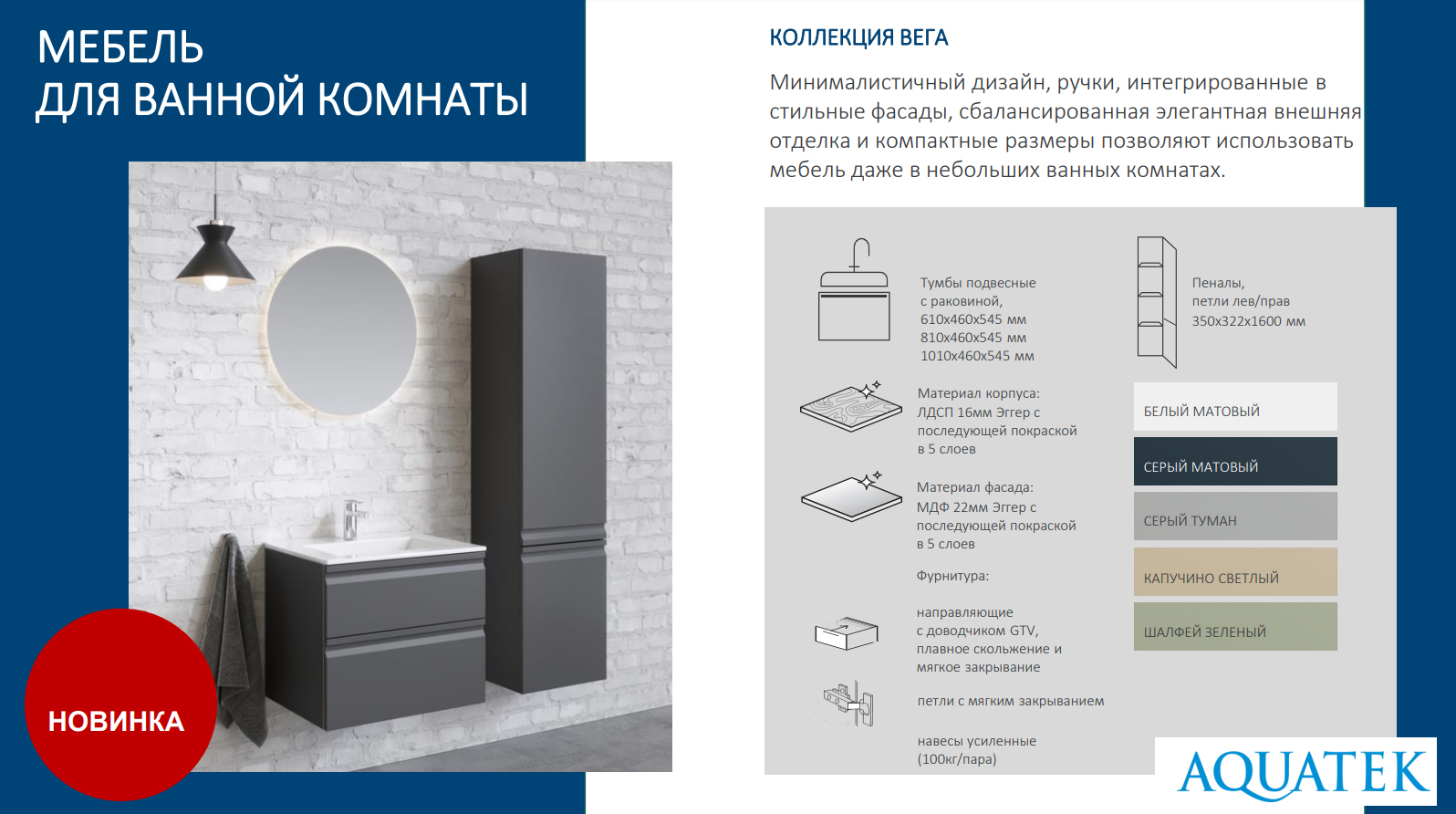 Качественные материалы: корпус изготовлен из влагостойкого ЛДСП, фасады из ЛМДФ с последующей покраской в 5 слоев с технологией УФ-отверждения, что обеспечивает долговечность и устойчивость к воздействию влаги.