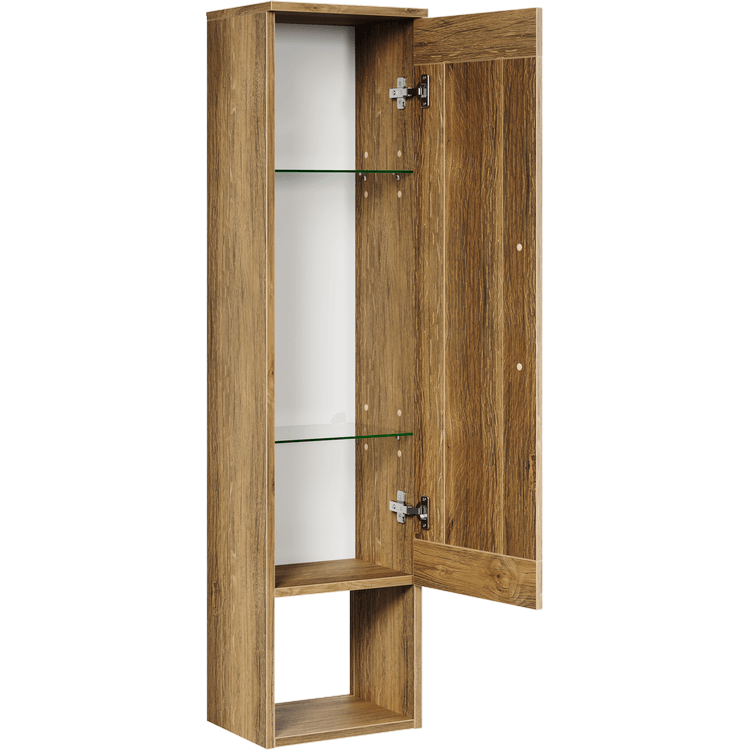 Подвесной пенал – универсален. Дверь может открываться вправо или влево. Стеклянные полки внутри пенала легко регулируются на нужную высоту. Благодаря навесам мебель выдерживает нагрузку до 200 кг.