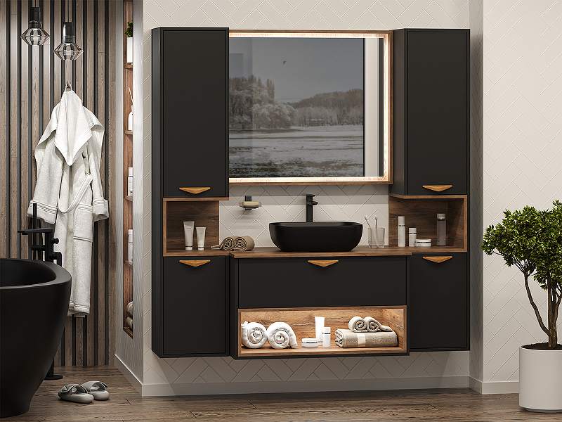 Bergen – это современный элегантный стиль, который по достоинству оценят современные люди, ценящие уют и гармонию.Особую изящность тумбе придает подвесной тип монтажа и эффектная подсветка нижней полки. Выдвижной ящик тумбы оснащен бесшумными доводчиками и дизайнерской ручкой из дерева.
