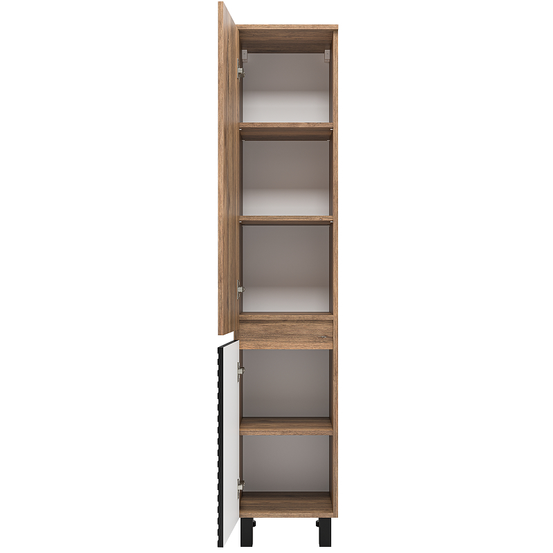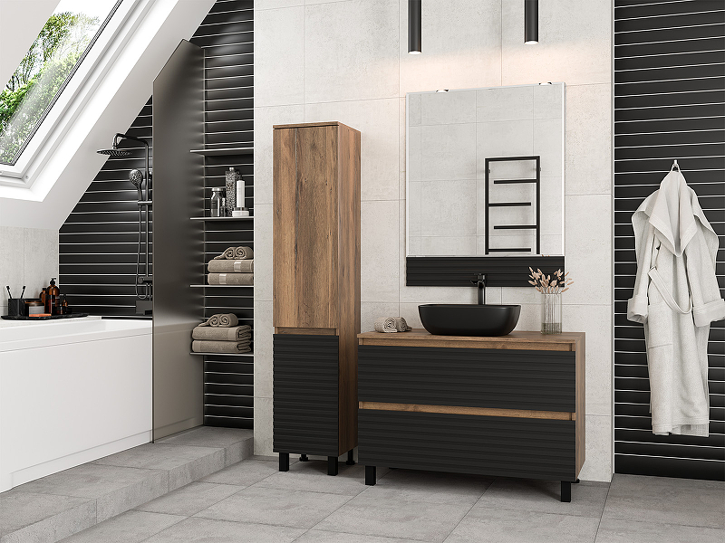Dakota - комплект мебели в ванную комнату от бренда Brevita. В качестве основной цветовой гаммы было выбрано сочетание древесной текстуры (Дуб Галифакс олово) с черными или белыми фрезерованными фасадами, на выбор. Такая композиция находится в тренде последние несколько сезонов. Лаконичный и одновременно выразительный внешний вид позволит использовать мебель для ванной в интерьерах в стиле лофт, хай-тек или минимализм. Материал обладает повышенной стойкостью к воздействию влаги и легко очищаются от бытовых загрязнений. Пенал можно устанавливать на пол или подвешивать на стену.
