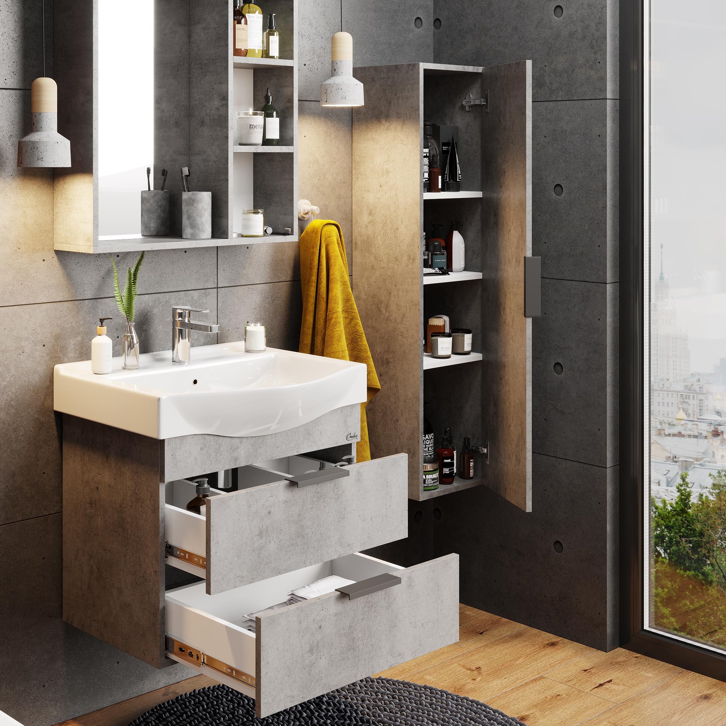 Подвесной шкаф пенал для ванной комнаты Onika ДЕВИС 30 отличается чёткой геометрией форм и создан для тех, кто ценит современный лаконичный дизайн, холодный брутальный эффект бетона чикаго, а также безупречное исполнение. Внутреннее пространство пенала поделено полками на 4 секции, что позволяет разместить различные косметические средства. Дверь снабжена механизмом плавного закрывания. Пенал имеет универсальную ориентацию: при установке верх и низ пенала можно менять местами, а дверцы могут открываться как влево, так и вправо. Пенал выполнен из ЛДСП, устойчивой к механическим воздействиям, перепадам температур и высокой влажности, при этом он надежно крепится к стене и не занимает место на полу, не создавая при этом сложностей в уборке помещения. Ручка и подвесы для крепления пенала - в комплекте.
