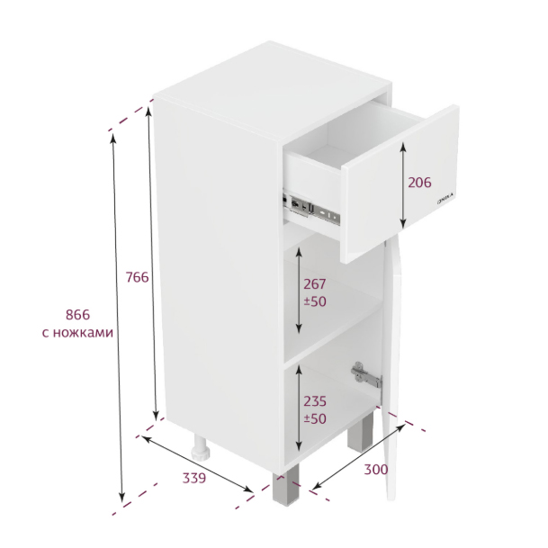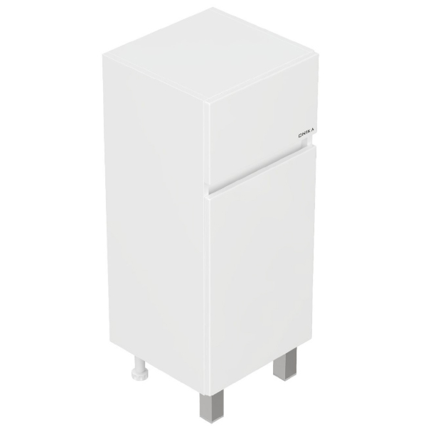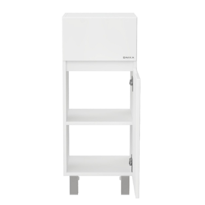 Оптимальная высота пенала позволяет использовать его поверхность как дополнительную столешницу, небольшой удобный ящик с направляющими полного выдвижения подойдет для хранения мелких аксессуаров, а распашная дверца скрывает вместительное внутреннее пространство с регулируемой по высоте полочкой, на которой можно компактно разместить бытовые принадлежности.