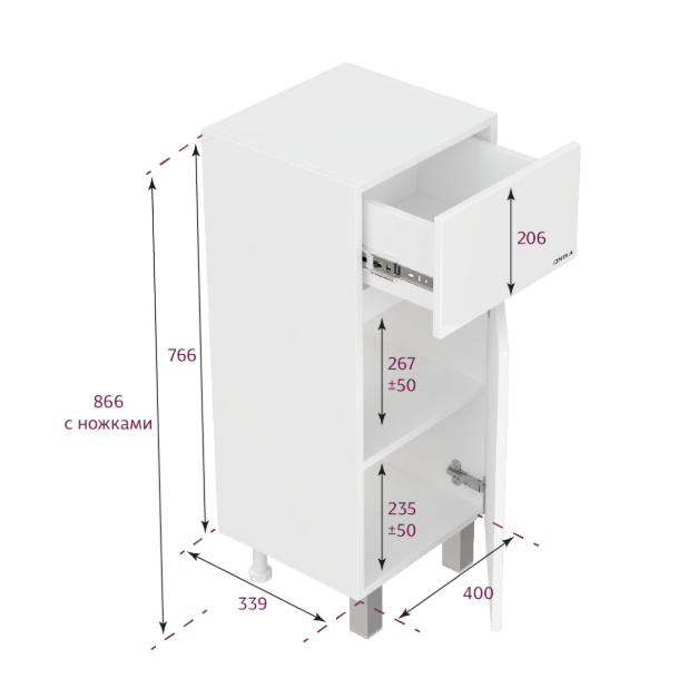 Оптимальная высота пенала позволяет использовать его поверхность как дополнительную столешницу, небольшой удобный ящик с направляющими полного выдвижения подойдет для хранения мелких аксессуаров, а распашная дверца скрывает вместительное внутреннее пространство с регулируемой по высоте полочкой, на которой можно компактно разместить бытовые принадлежности.