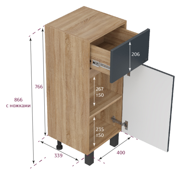 Оптимальная высота пенала позволяет использовать его поверхность как дополнительную столешницу, небольшой удобный ящик с направляющими полного выдвижения подойдет для хранения мелких аксессуаров, а распашная дверца скрывает вместительное внутреннее пространство с регулируемой по высоте полочкой, на которой можно компактно разместить бытовые принадлежности.