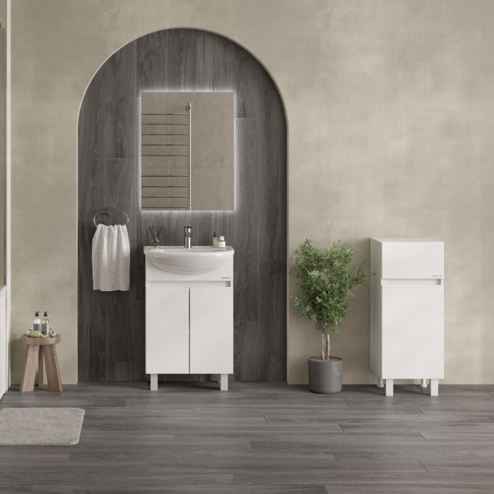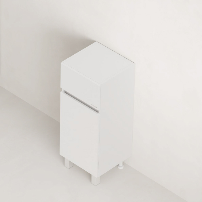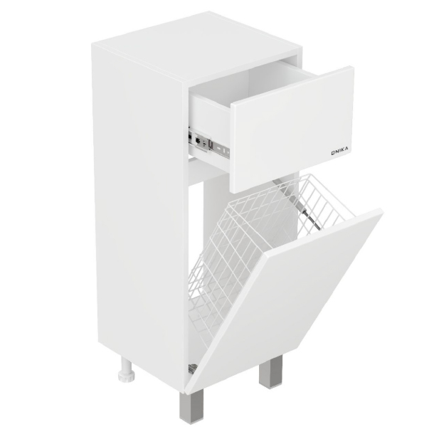 Оптимальная высота пенала позволяет использовать его поверхность как дополнительную столешницу, небольшой удобный ящик с направляющими полного выдвижения подойдет для хранения мелких аксессуаров, а за дверцей скрывается отделение с корзиной для белья.