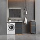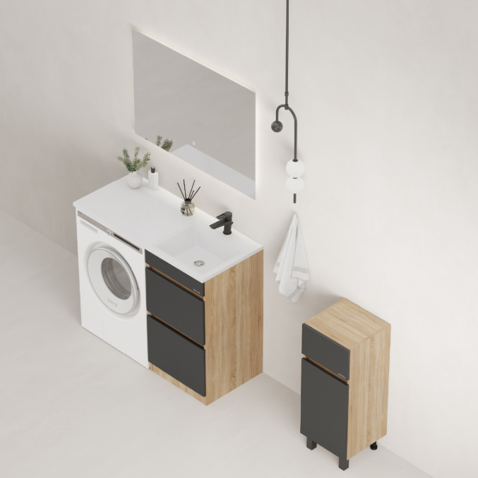Оптимальная высота пенала позволяет использовать его поверхность как дополнительную столешницу, небольшой удобный ящик с направляющими полного выдвижения подойдет для хранения мелких аксессуаров, а за дверцей скрывается отделение с корзиной для белья.