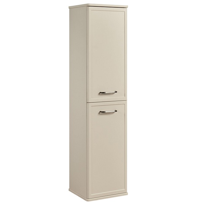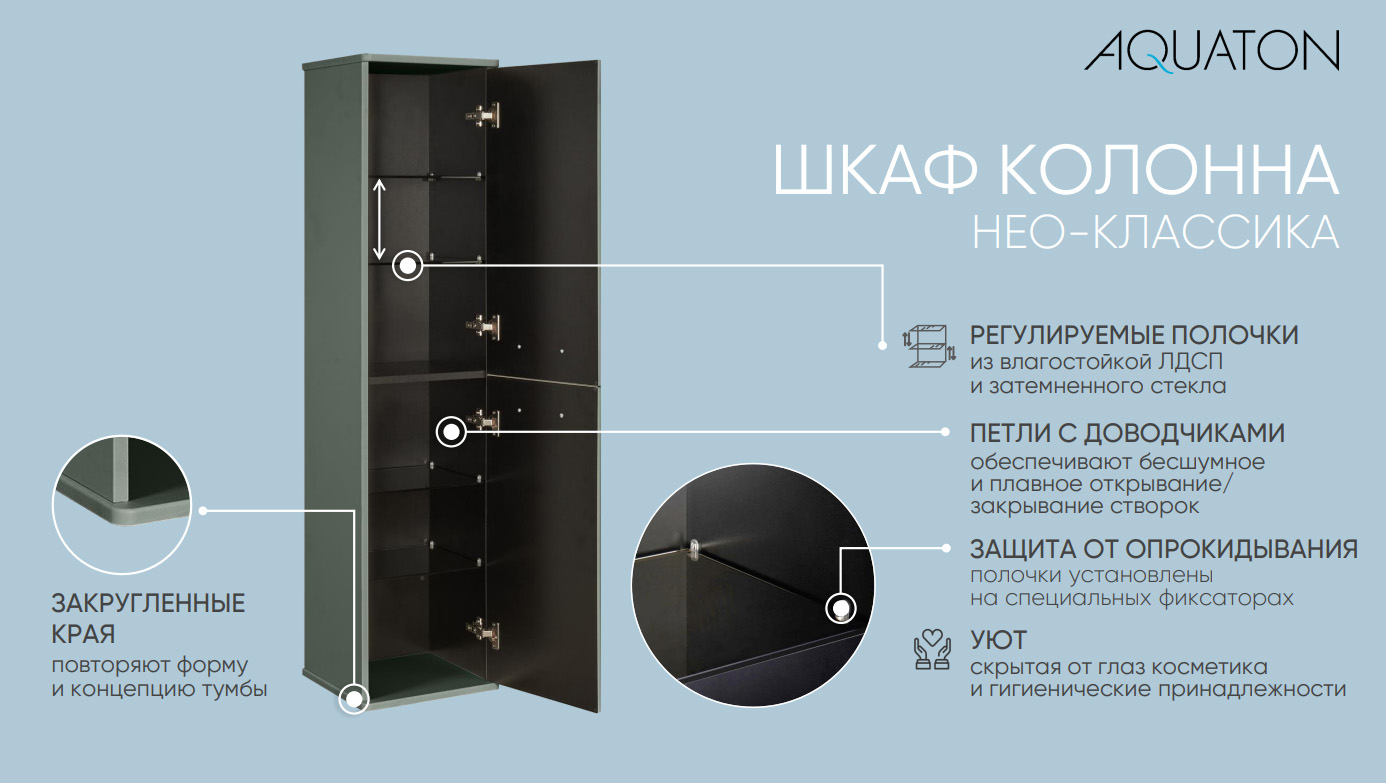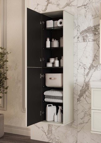 Шкаф-колонна изготовлена из высококачественной МДФ, покрытой матовой плёнкой. Фасады с фрезеровкой в рамочной форме гармонично сочетаются с остальными предметами этой коллекции. В колонне за фасадами-створками скрываются полочки из затемненного стекла, они установлены на специальных держателях, которые предотвращают опрокидывание. Фасады открываются при помощи удобной ручки, а благодаря петлям с доводчиками обеспечивается плавное закрытие, что гарантирует бесшумность и комфорт использования мебели. Продуманная эргономика позволит рационально использовать вместительное пространство за фасадами-створками, а регулируемые полочки не ограничивает высоту ванных принадлежностей. Скрытая от глаз косметика, гигиенические принадлежности создают в помещении уют.