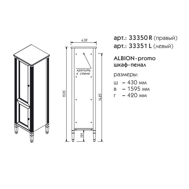 Шкаф-пенал Caprigo Albion Promo 43х160 см 33350R/ 33351L цвета разные