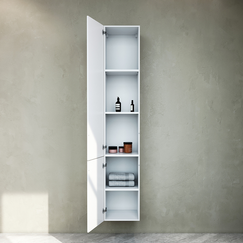 - пять полочек в шкафу-пенале оптимизируют пространство для хранения ванных принадлежностей и моющих средств;