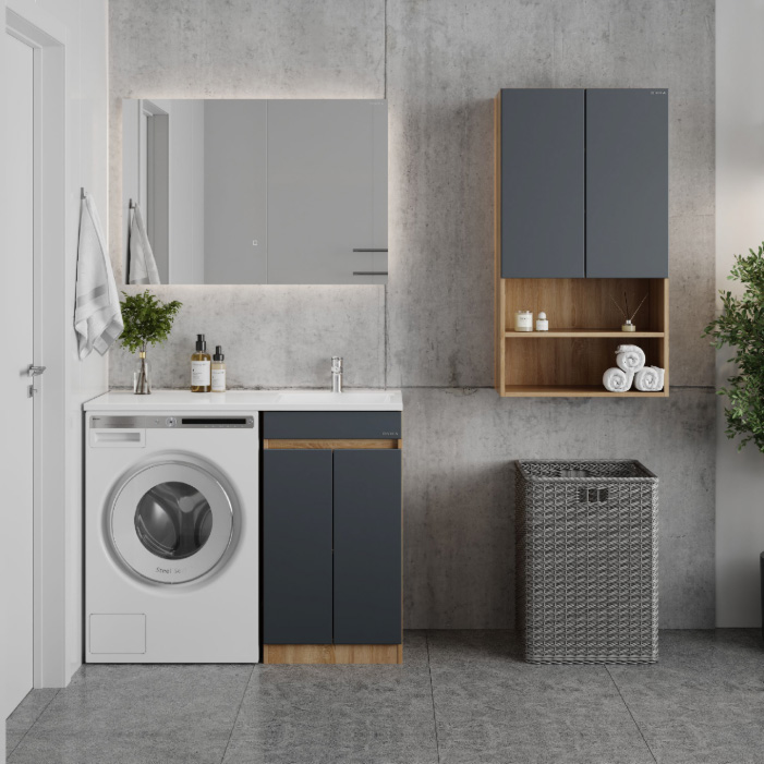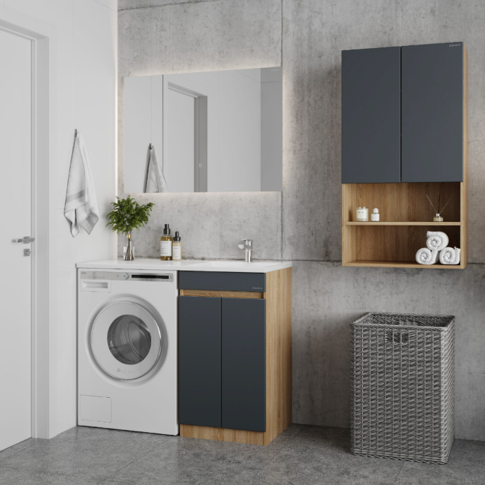 Шкаф сочетает в себе красоту и функциональность: серый матовый фасад с покрытием SoftTouch, корпус цвета дуб сонома с роскошной текстурой, строгие формы без декора.