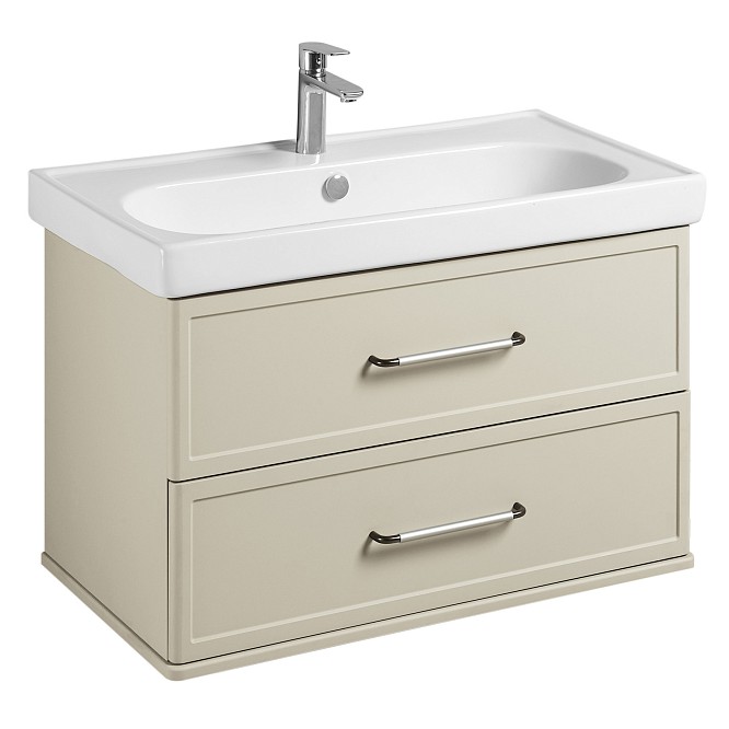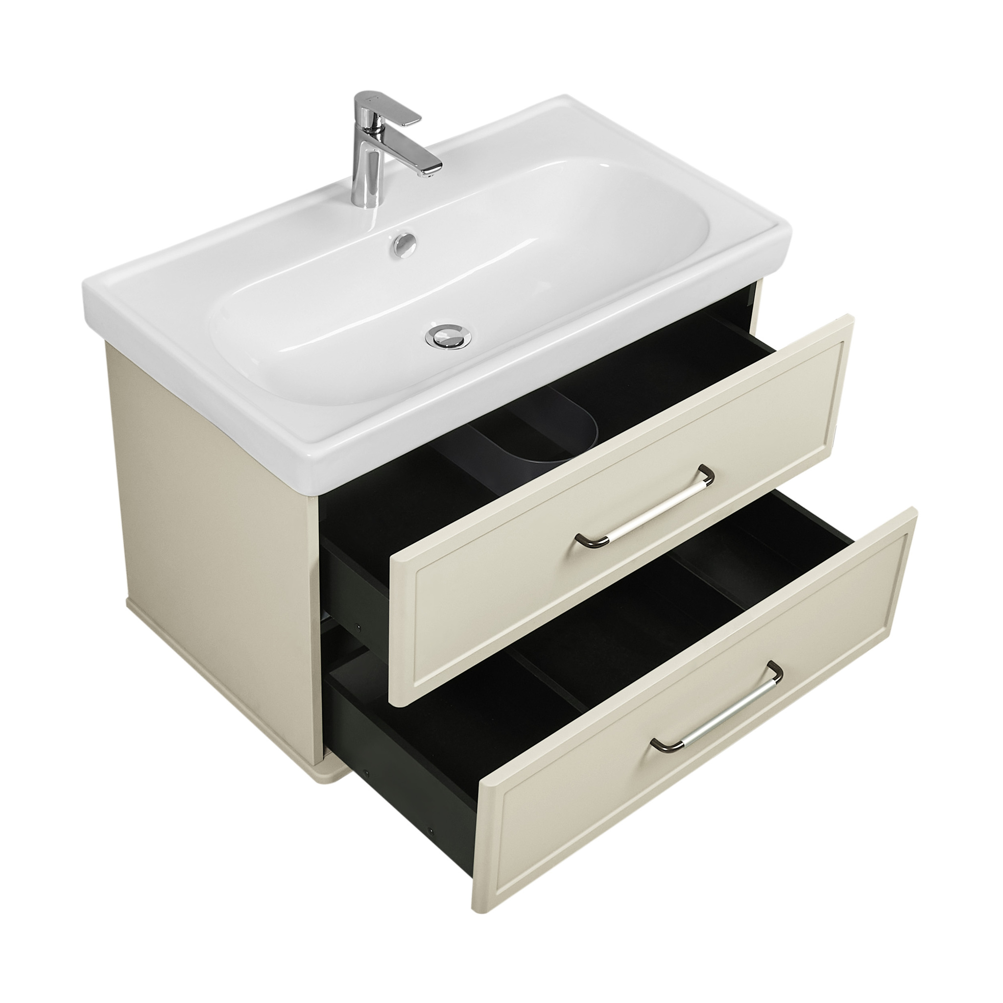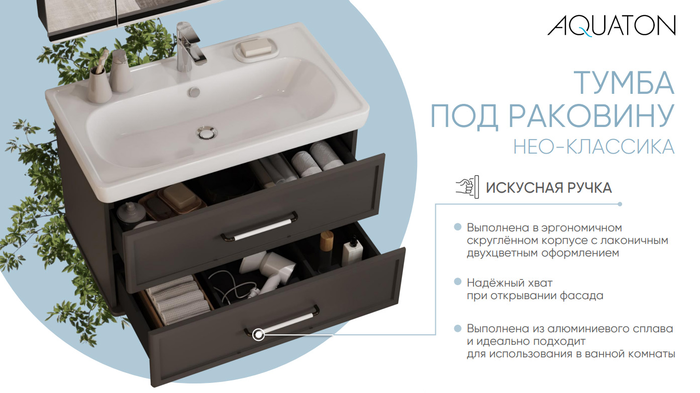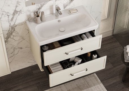 Тумба изготовлена из высококачественной МДФ, покрытой матовой плёнкой. Фасады с фрезеровкой в рамочной форме гармонично сочетаются с остальными предметами этой коллекции. В тумбе есть два вместительных ящика с эргономичной организацией пространства, которую можно настроить по своему удобству. Ящики открываются при помощи удобной ручки, а благодаря направляющим с доводчиками обеспечивается плавное закрытие, что гарантирует бесшумность и комфорт использования мебели.