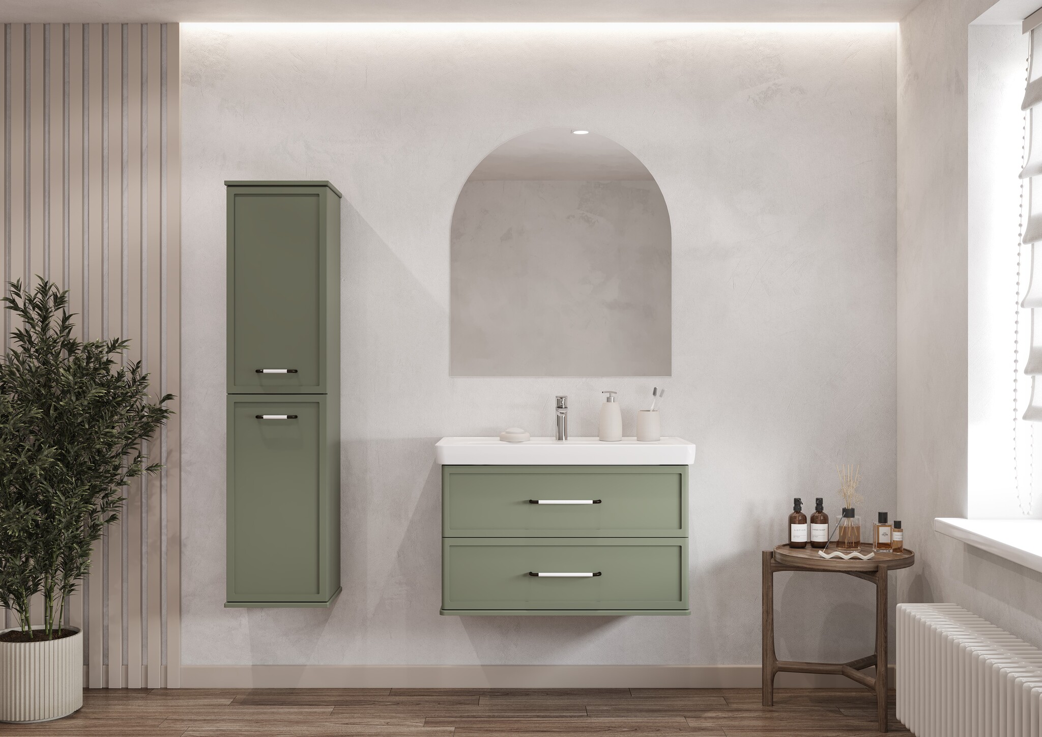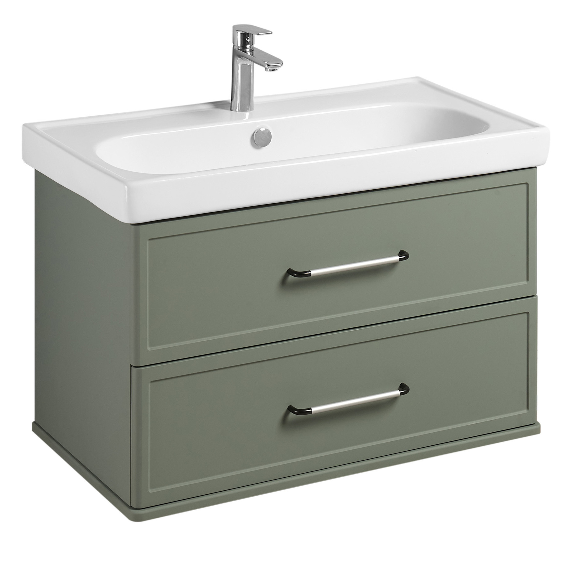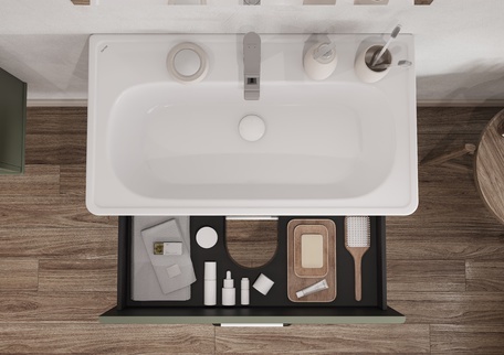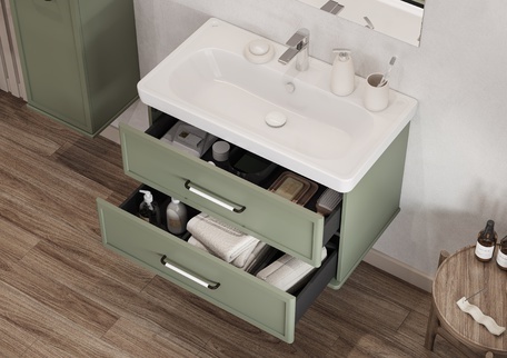 Тумба изготовлена из высококачественной МДФ, покрытой матовой плёнкой. Фасады с фрезеровкой в рамочной форме гармонично сочетаются с остальными предметами этой коллекции. В тумбе есть два вместительных ящика с эргономичной организацией пространства, которую можно настроить по своему удобству. Ящики открываются при помощи удобной ручки, а благодаря направляющим с доводчиками обеспечивается плавное закрытие, что гарантирует бесшумность и комфорт использования мебели.